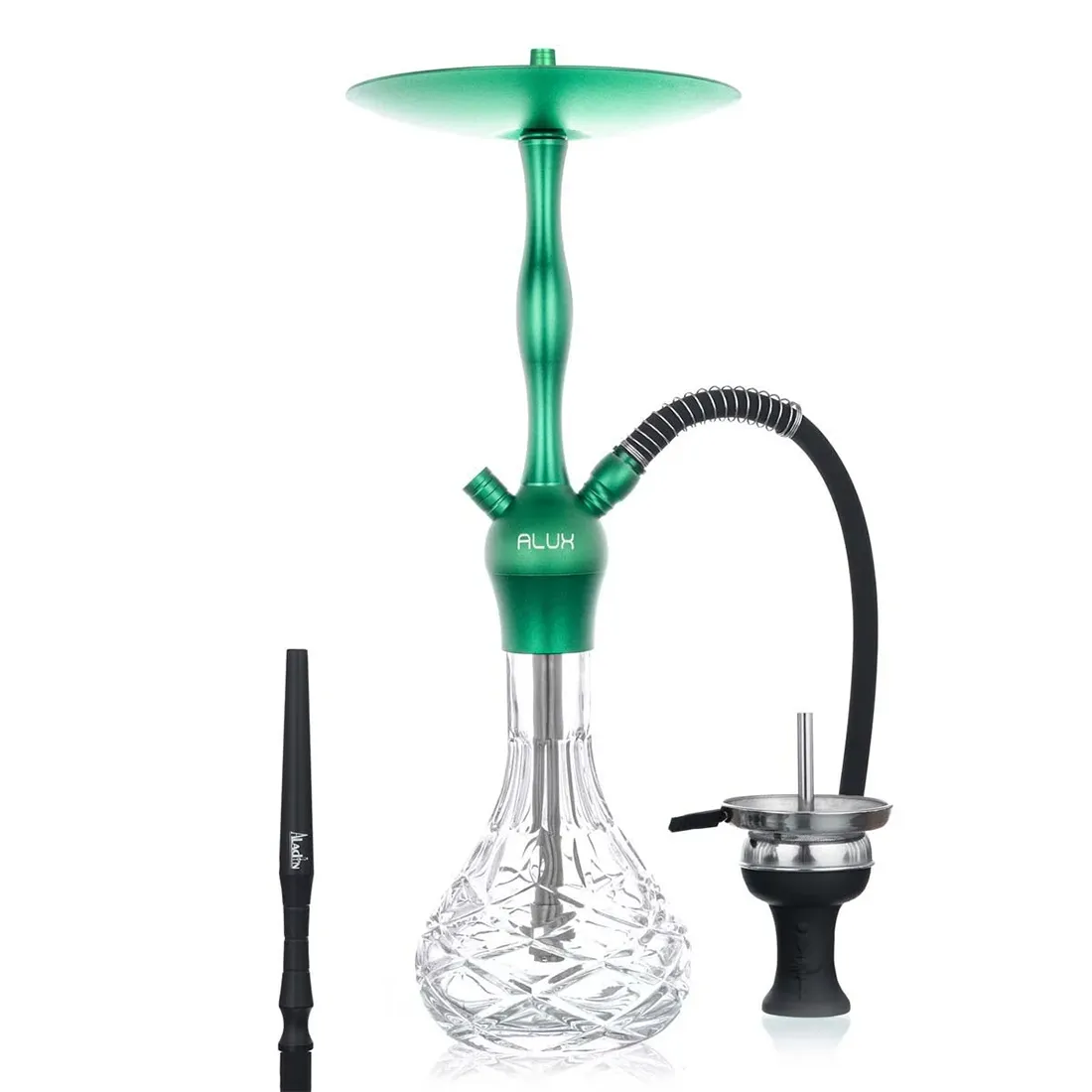 Denne Alux Admiral vandpibe fra Aladin Shisha, er fremstillet i en grøn og elegant farve, som gør det til en flot og god funktionel begynder vandpibe på 50 cm, der kombinerer letvægt, kvalitet og det moderne design. Den grønne anodiserede aluminiumsøjle står i flot kontrast til den klare glaskolbe, og giver piben et frisk og stilrent udtryk, som passer til enhver indretning.Som alle Admiral modeller leveres den som et komplet sæt, klar til brug, med både silikoneslange og kaminhoved, så alt du skal tilføje er kul og tobak (medfølger ikke). Click-lock systemet gør samlingen og rengøringen nemt, mens det lukkede kammer sikrer en effektiv luftgennemstrøm, så du hurtigt kan puste røgen ud. Diffusoren på “dypperøret” kan justeres eller fjernes, afhængigt af hvor let og stille et sug du foretrækker. Modellen har ét 18,8 mm slangeudtag, men kan nemt udvides til to, ved tilkøb af en ekstra adapter.