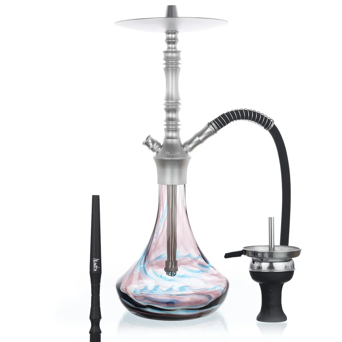 Aladin Alux M2.1 i lilla farve, er en elegant og funktionel vandpibe på 54 cm, i en altid god kvalitet som vi kender Aladin for. Den lette aluminiumsøjle og den farverige glaskolbe, giver vandpiben et moderne udtryk, samtidig med at materialerne sikrer lang en holdbarhed, og en behagelig rygeoplevelse hver gang. Den leveres som et komplet sæt med alt hvad du skal bruge for at komme i gang: kaminhoved, silikoneslange og kultang. Piben er udstyret med click lock system, som gør det hurtigt og nemt at samle eller skille den ad, og de præcise slibeforbindelser (18,8 mm) giver mulighed for at montere både molassefanger og ekstra tilbehør uden problemer. Den har et lukket kammer, som effektivt leder røgen ud når du puster, og sikrer en ren og stabil gennemstrømning. Diffusoren i bunden af dypperøret kan justeres eller fjernes helt, så du selv bestemmer flowet i vandet og dermed sugestyrken, så du kan ramme dine fortrukne præferencer, og opnå det perfekte sug hver gang . Piben leveres som standard med ét slangeudtag, men kan nemt udvides til to ved køb af en ekstra adapter. Med en højde på 54 cm er Alux M2.1 både elegant på bordet og praktisk i brug, og de flotte farver giver den et friskt pust til enhver samling.