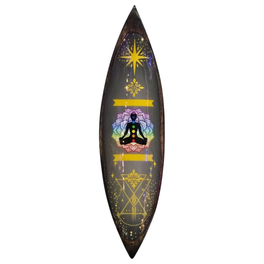 Skålen har et emaljeret chakra-motiv. Chakraer er de syv energicentre i kroppen ifølge indisk filosofi. De strækker sig fra rodchakraet ved bækkenbunden til kronechakraet på toppen af hovedet, og hvert chakra har sin egen farve: rød, orange, gul, grøn, blå, indigo og violet. Motivet på skålen viser typisk de syv chakra-symboler i deres respektive farver. Emaljeringen giver farverne et blankt finish mod det naturlige træ.