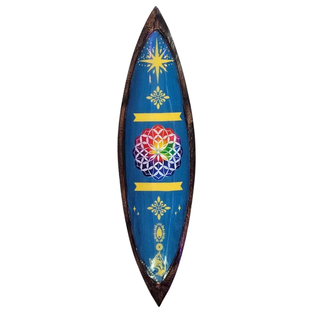 mandala-motiv med farverige detaljer, der står smukt mod det naturlige træ.