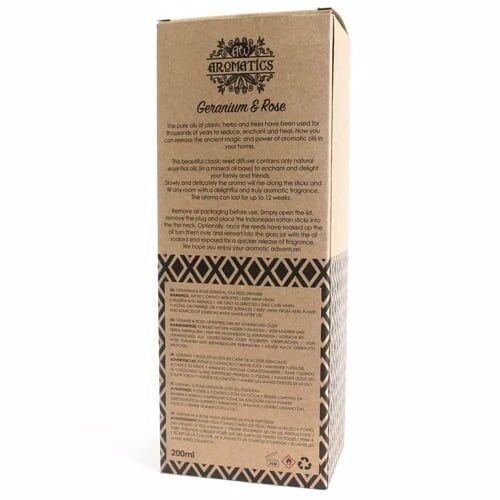 Disse Aromatics Geranium & Rose Æterisk Olie Duftpinde, er en skøn blanding af blomstrende geranium og fortryllende rose, som vil sprede en skøn duftkomposition og give en behagelig og beroligende aroma i dit hjem. De naturlige æteriske olier, der er opløst i en mineraloliebase, sikrer en langvarig og intens duftoplevelse. Med de medfølgende indonesiske rattanpinde, kan du nemt og elegant sprede duften i ethvert rum. Fjern al emballage, åbn låget og indsæt pindene i flasken. Vend eventuelt pindene når de har optaget olien, for en hurtigere frigivelse af duften. Nyd den luksuriøse duft af Geranium & Rose, og skab en atmosfære af ro og velvære i op til 12 uger.