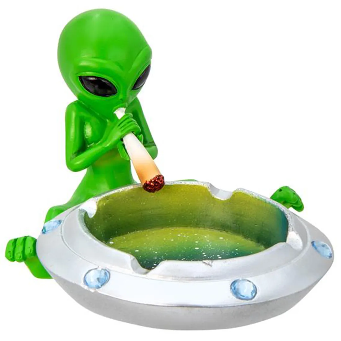 Dette alien askebæger er noget helt for sig selv, nemlig et rundt askebæger i UFO design, og med en grøn alien der sidder og ryger en joint. Med sine fire indhak kan du nemt placere både cigaretter og joints, når du vil have hænderne fri og laden jointen hvile.Askebægeret måler ca. 13 x 16,4 x 15 cm, og selve skålen har en diameter på 105 mm, hvilket giver god plads til aske og skodder. Det er fremstillet i polyresin, hvilket giver en solid vægt og et detaljeret udtryk, og farvekombinationen i grøn og sølv gør det til et godt blikfang på bordet.Et askebæger der både er praktisk og sjov dekoration på samme tid, samt den perfekt gaveidé.
