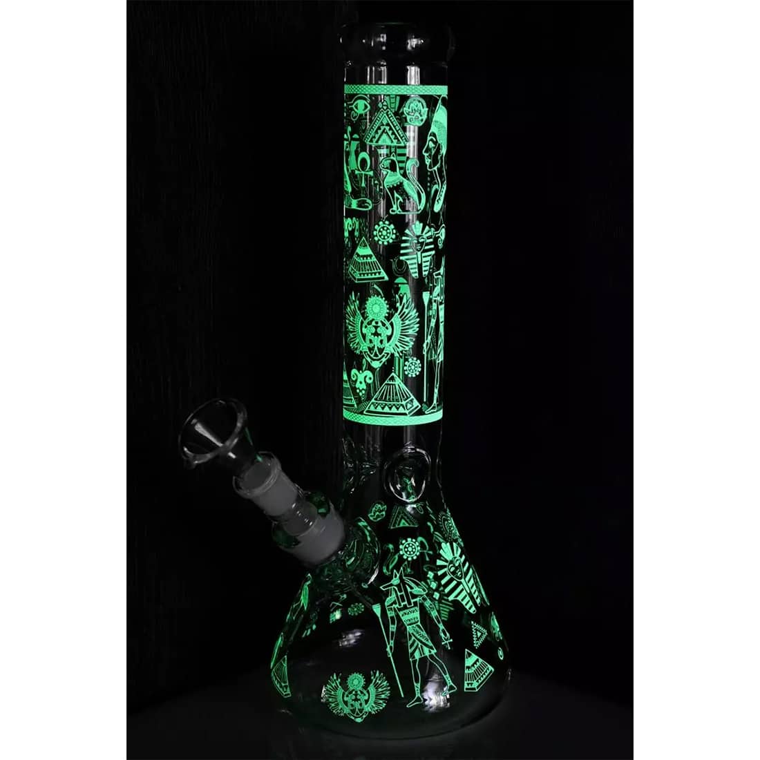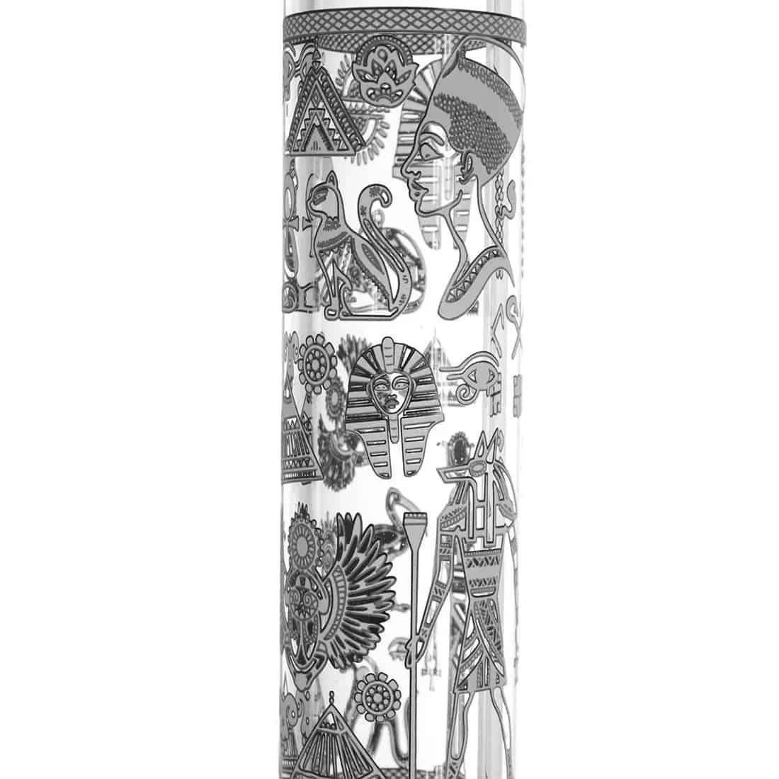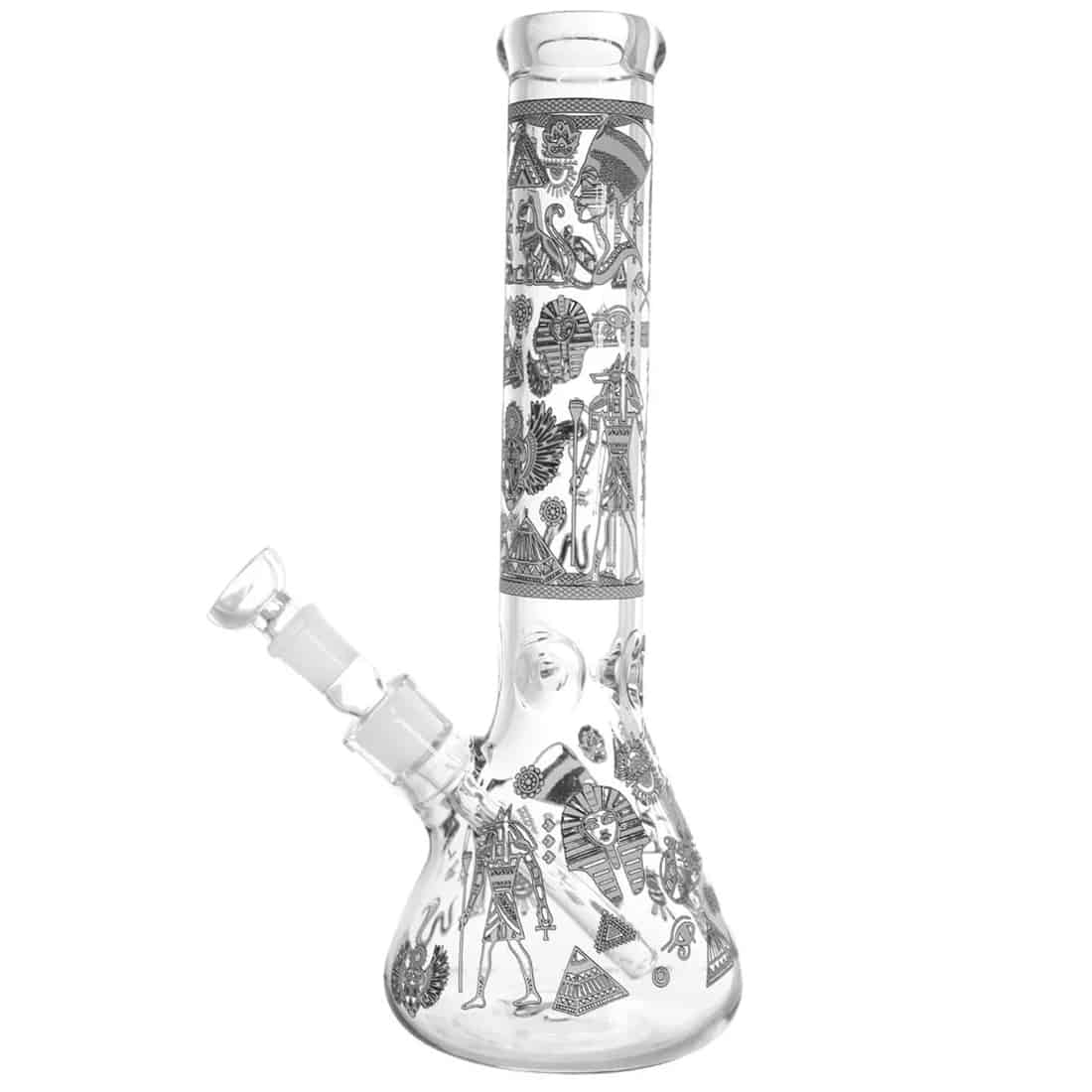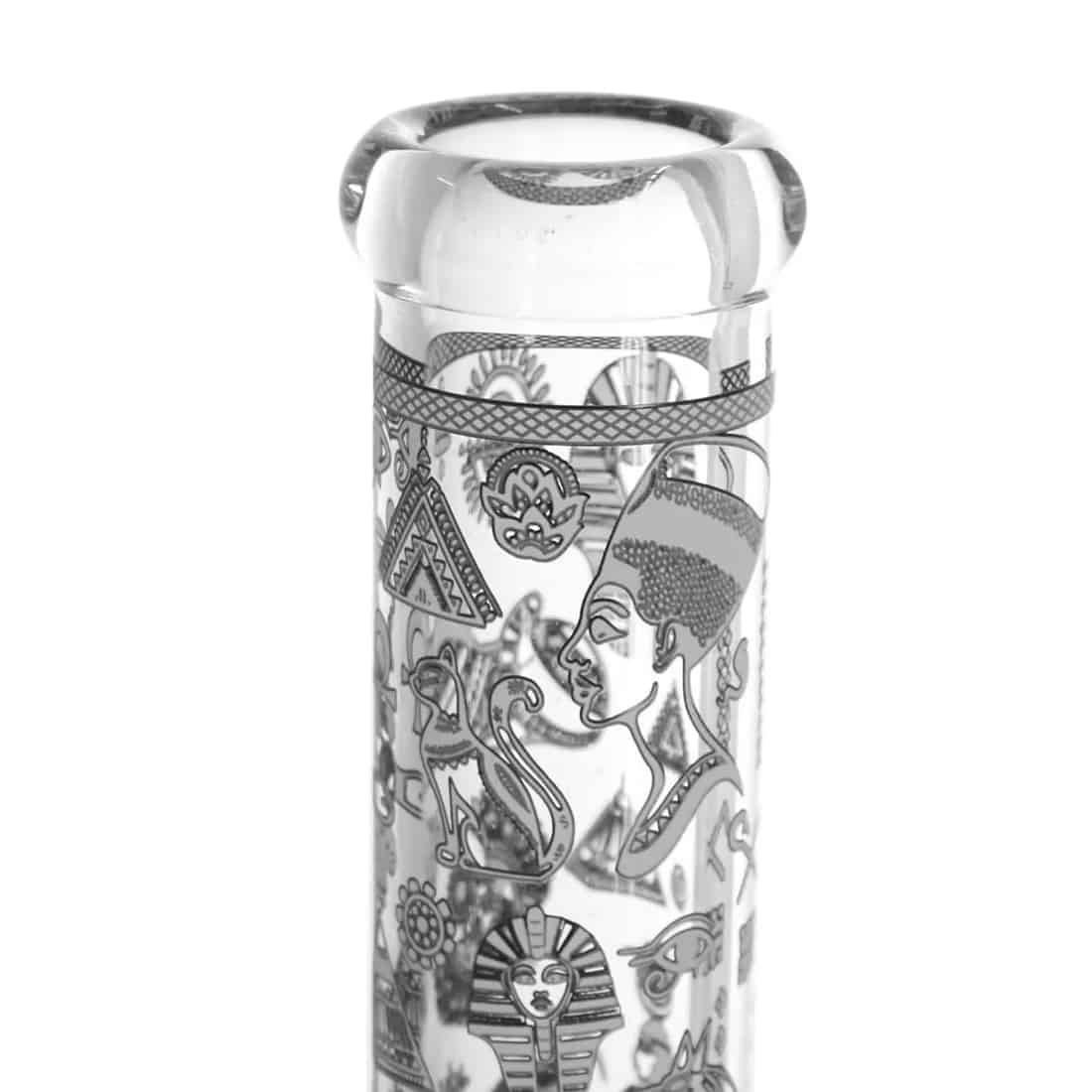 Denne beaker bong er dekoreret med et elegant, selvlysende egyptisk print, der vil få enhver rygeoplevelse til at føles mere kongelig. Højden på 36 cm og diameteren på 55 mm gør den velegnet til de fleste bongrygere, men hovedet kan være sværere for begyndere at bruge da det er ekstra stort. Det runde mundstykke giver en god følese for læberne, og isfangeren hjælper med at give en glat og kølig røg, ved at holde masser af isterninger op ad halsen hvis dette ønskes. Vi anbefaler at bruge et 12-15mm rist med denne bong. Bemærk venligst, at der ikke er noget sliphul på siden, så du skal løfte hovedet når du inhalerer røgen. God fornøjelse og ryger!