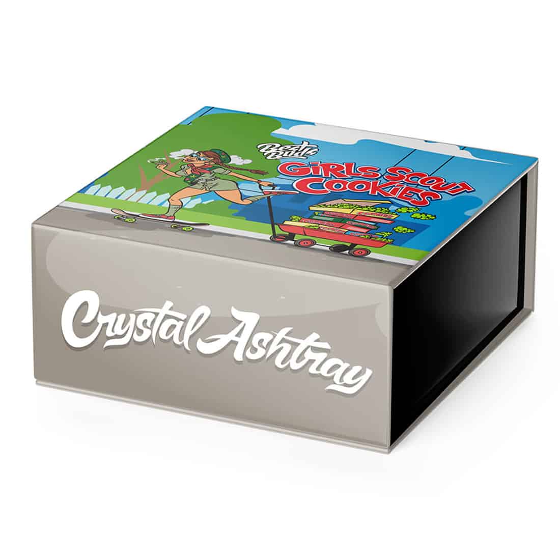 Med dette elegante krystalaskebæger fra Best Buds, får du et kvalitets askebæger med et Girl Scout Cookies-motiv i midten, samt flotte detaljer hele vejen rundt. Det kommer med 4 hak på siden, så der er plads til flere joints og/eller cigaretter på samme tid. Dette er en ideel gave til din cannabiselskende ven, da den leveres i en flot æske i samme design.