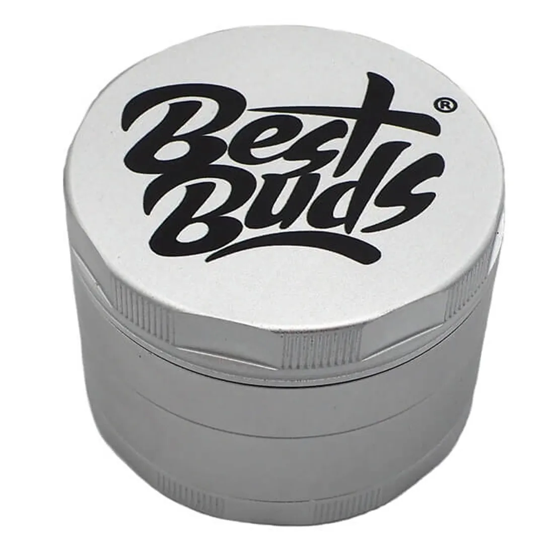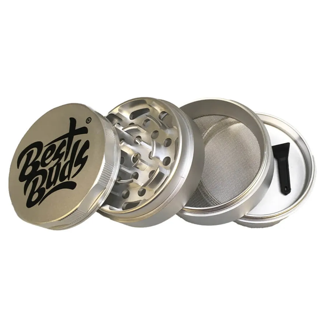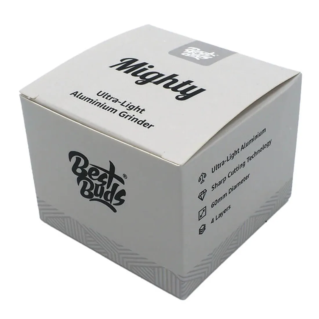 Denne Best Buds Mighty Silver Grinder er en god og robust grinder, fremstillet af højeste kvalitets aluminium, der sikrer en meget langvarig holdbarhed. Med en diameter på 60 mm, er den både let at håndtere og grinde med, og stor nok til at kværne større mængder plantemateriale ad gangen, hvilket gør den ideel til de mere erfarne potrygere, der fortrækker at ryge rent direkte i pibe eller vape. Grinderen består af fire dele, og er udstyret med lange, skarpe “skinne tænder”, der effektivt kværner dit plantemateriale til en grov konsistens, og derfor ikke egnet til jointmix. I bunden finder du et ekstra rum til opsamling af det overskydende ryst (kief), og der medfølger også en praktisk skraber, så du nemt kan samle det overskydende sammen til en specielt anledning. Husk at rengøre grinderen jævnligt, specielt i kanten, for at opretholde den gode friktion.