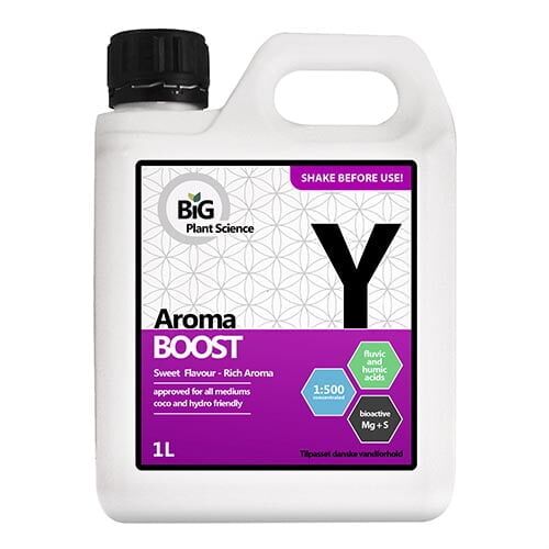 Denne Aroma Boost (Y) er produceret af Big Plant Science, og udviklet som en professionel aromaforstærker, der indeholder alle de rigtige byggesten, der findes i aromatiske molekyler, som er det der er i plantens krystaller. Det er sammensætningen samt koncentrationen af disse, som også indeholder bioaktivt svovl, magnesium-komplekser, og et specielt aminogram, der er rigt på L-glutaminsyre, der sammen giver planten sin gode karakteristiske duft. Herudover er Aroma Boost, også tilsat pro-humiske og fluviske syre, der begge øger optagelsen af gødning, så du får fuld udnyttelse af din Big Plant Science gødning. Sidst men bestemt ikke mindst, så tilføjer Aroma Boost også en bedre smagsoplevelse på dit endelige slutprodukt, hvilket jo faktisk er den vigtigste del i hele processen.