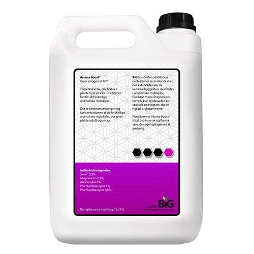 Denne Aroma Boost (Y) er produceret af Big Plant Science, og udviklet som en professionel aromaforstærker, der indeholder alle de rigtige byggesten, der findes i aromatiske molekyler, som er det der er i plantens krystaller. Det er sammensætningen samt koncentrationen af disse, som også indeholder bioaktivt svovl, magnesium-komplekser, og et specielt aminogram, der er rigt på L-glutaminsyre, der sammen giver planten sin gode karakteristiske duft. Herudover er Aroma Boost, også tilsat pro-humiske og fluviske syre, der begge øger optagelsen af gødning, så du får fuld udnyttelse af din Big Plant Science gødning. Sidst men bestemt ikke mindst, så tilføjer Aroma Boost også en bedre smagsoplevelse på dit endelige slutprodukt, hvilket jo faktisk er den vigtigste del i hele processen.