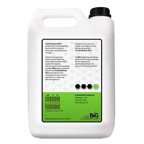 Med Calcium Plus Part B fra Big Plant Science, får du en perfekt og optimal calcium-nitrat-aminosyre formular, der sikrer at planten ikke kommer i underskud af calcium. Der er yderlig tilsat 2% aminosyre, som forøger calcium optagelsen samt celledannelsen. Ved at bruge denne formular, tvinger du planten til at optage calcium, og dermed kan du opnå stærkere og mere solide stænger på planten, som kan holde til at bære tunge topskud. Men hvorfor dog denne traditionelle calcium-nitrat blanding? Det er der flere grunde til, men den optimale måde at forøge calcium optagelsen, er via rodnettet. Planten optager ca. 1,5 gange så meget calcium som kvælstof, og ca. 3 gange så meget som fosfor. Det er derfor vigtigt at at bestemme hvilken vandtype der er til rådighed. (hårdt, middelhårdt, eller blødt) samt at anvende et passende gødningsskema dertil.