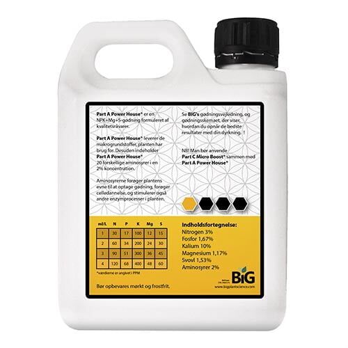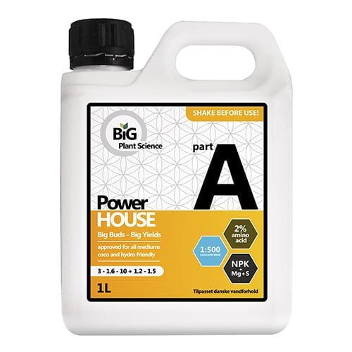 Denne Power House part A+C fra Big Plant Science, giver alle de makro næringsstoffer, planter bruger igennem både vækst og blomstringfasen. Der er tilsat 2% aminosyre, som forøger dannelsen af celler, og samtidig optimere planternes evne til at optage gødning. Det vigtigste grundstof for planten samt væksten, er kvælstof (N), hvis planten ikke får en passende mængde af kvælstof, opnår du ikke den optimale mængde eller kvalitet af slutproduktet. Kvælstoffet der findes i denne Power House A formel, er 100% nitrat basseret, og indeholder ikke ammonium der modsat nitrat, er giftig for planten. Kvælstof er det vigtigste grundstof hvis du går efter et stort afkast, og derfor også vigtigt at du presser dine planter maksimalt. Dette kan du med hjælp fra Power House A, der samtidig indeholder store mængder af fosfor og kalium (P-K), hvilket sikrer tunge topskud. Der findes også magnesium og svovl (Mg-S) i Power House A+C, som giver ekstra mange krystaller, samt en solid æterisk olieproduktion i den høje ende.