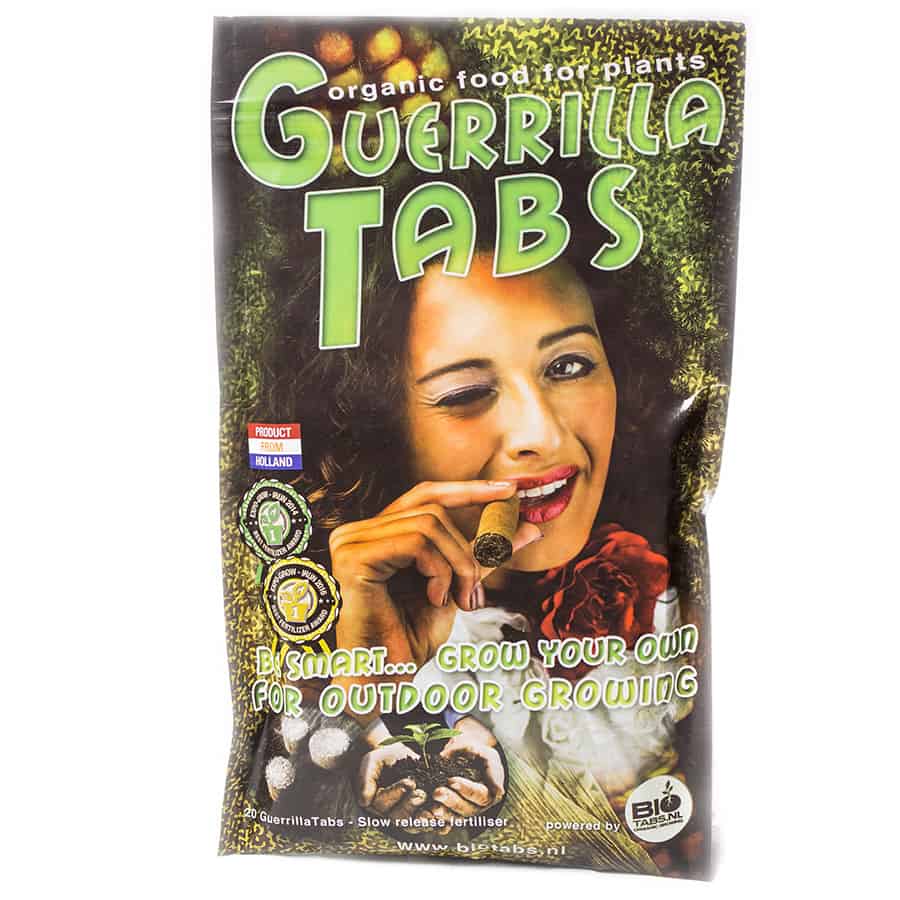 Guerrilla tabs fra BioTabs er økologiske og langsomt optagende gødningstabletter, der forbedrer dine planter igennem mikrobiologisk aktivitet, og samtidig leverer en nødvendig gødning til dine planter. Guerrilla tabs kan både bruges udendørs som indendørs, samt direkte i jord eller pottede planter. Brug 4 tabs pr. 10 liters potte, 6 tabs pr. 20 liters potte, 8 tabs pr. 30 liters potter. Hvis du skal bruge dem i jorden, så brug 4 tabs pr. plante. Skub tabletterne ca. 5 cm dybt under jordoverfladen, og giv derefter vand. Med disse tabs får du også fordelagtige rhizobakterier, også behøver du ikke justere PH eller EC, når du bruger disse tabs.