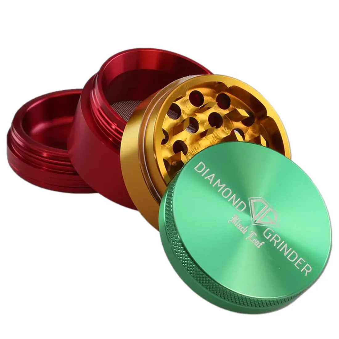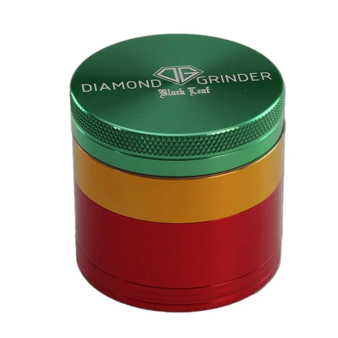 ProduktbeskrivelseDenne Black Leaf Diamond Grinder i rasta farver er perfekt til dig, der ønsker en grinder med både stil og lang holdbarhed. Grinderen er fremstillet i robust flyaluminium, der med skarpe diamantformede tænder kværner både blødt og hårdt plantemateriale, mens den finmaskede pollenrist i rustfrit stål, sørger for at alt ryst ryger ned i pollenkammeret. Grinderen er udstyret med et magnetisk låg, der holder delene sikkert sammen, og en nylonring der sikrer en glidende rotation.Produktdata