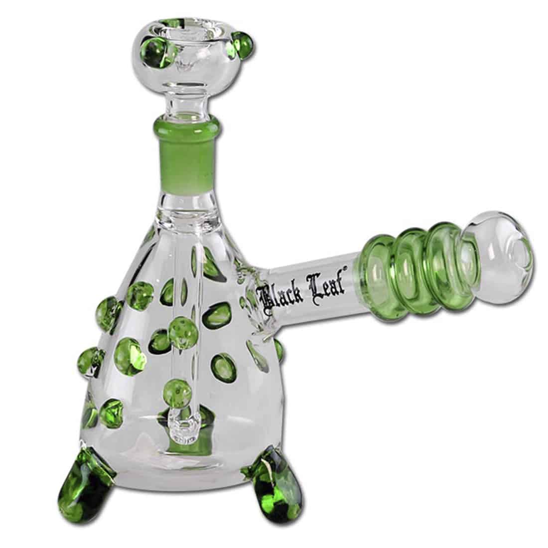 Dette er en lille og praktisk Feet bong fra Black Leaf, som er produceret i klart varmebestandigt glas, og med grønne detaljer flere steder på bongen. Den kommer i en rejsevenlig størrelse, og med en højde på blot 15 cm, der gør den til en god rejsemakker når du skal på farten. Røgen indåndes komfortabelt gennem det ergonomiske mundstykke, imen der dannes et godt flow i boblerne fra vandet, der er med til at give et bedre sug, takket være “hole percolatoren” der sidder i bunden af slamrøret. Vi anbefaler at bruge en rist på 12,5 mm. til denne Black Leaf Feet Bong.