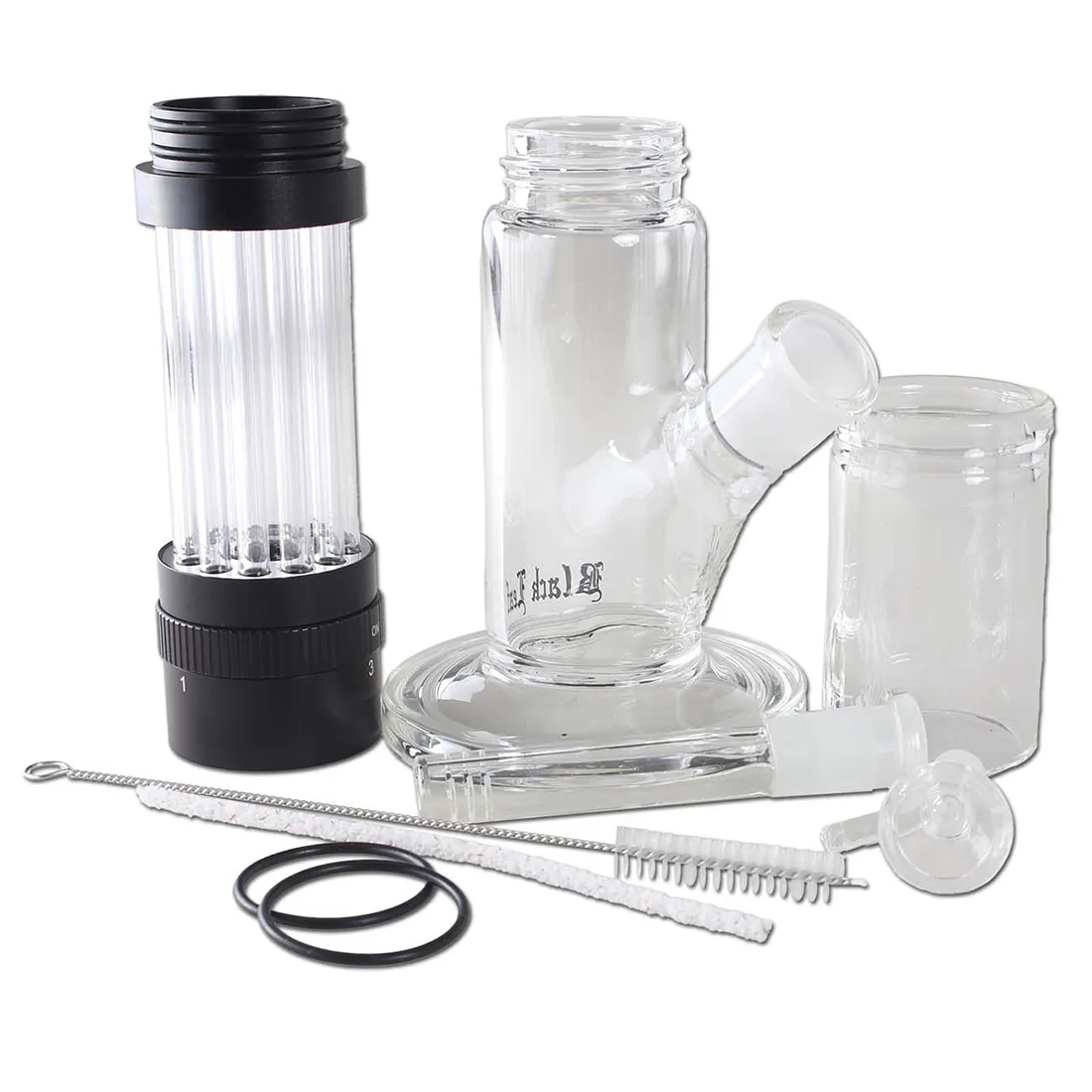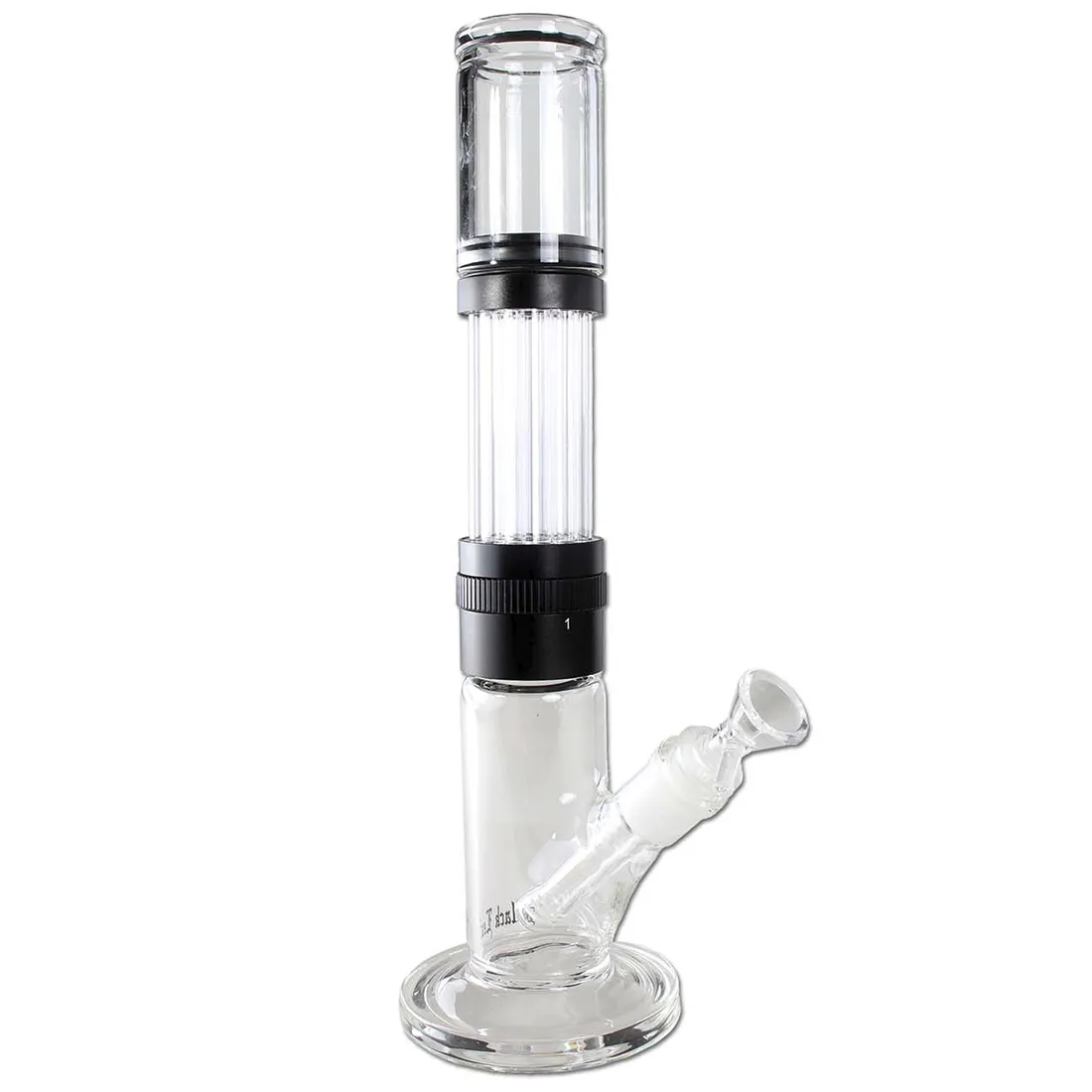 Dette unikke bongsæt fra Black Leaf, kommer i en 5-delt glasbong, der nemt kan skrues sammen med et gevindsystem, giver dig mulighed for at vælge mellem 3 forskellige niveauer, afhængig af dit ryge humør. Bongens base er udstyret med en stabil rund fod, og en SG 18,8 mm socket / indgang til slamrøret, der i øvrigt kommer med slits i bunden, og hjælper med at give et godt og jævnt bobble flow. Bonghovedet kommer in SG 14,5 mm størrelse, og er forsynet med et praktisk hank, der hurtigt kan løftes når røgen skal inhaleres. Niveauet justeres ved hjælp af et mellemstykke, der med en indvendig tube, og yderlig tolv ydre akryltuber omgivet af aluminium, perfekt til at kontrollere mængden af røg. Bongen leveres med mundstykke, rengøringsbørste, piberenser og to ekstra pakningsringe. Vi anbefaler at bruge en rist på 12,5 mm til dette bong kit.Vælg mellem følgende niveauer:Niveau 1: Kun den indre tube er åben, ideel til en klassisk ryger.Niveau 2: Kun de ydre tuber er åbne, hvilket giver en blød og mild røg, perfekt for begyndere.Niveau 3: Både indre og ydre tuber er åbne, for dem der ønsker den fulde og intense oplevelse.