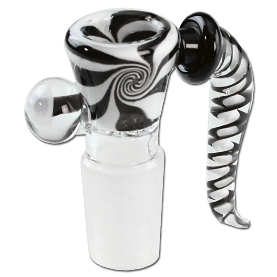 Hvis du søger et nyt bonghoved med kunstnerisk flair, er dette Black Leaf Glass Art Black Swirl Bowl et fantastisk valg! Håndlavet af flerfarvet borosilikatglas, kombinerer dette hoved både holdbarhed, flot design og gode funktioner. Det kommer nemlig med en stor hank, der gør det nemt at løfte og håndtere, især når du bruger en bong uden sliphul. Derudover har hovedet en rulle-stopper i form af en glasbold med en charmerende lille svamp indeni, som forhindrer det i at trille væk på bordet. Black Leaf-logoet er diskret indgraveret, og hovedet leveres i en elegant sort æske, hvilket gør det til en perfekt gave, eller som en praktisk opbevaringsløsning. Vi anbefaler at bruge en konisk rist på 12,7 mm.Bemærk at lufthullet er ekstra stort på 9 mm, og hovedet anbefales derfor ikke til begyndere.
