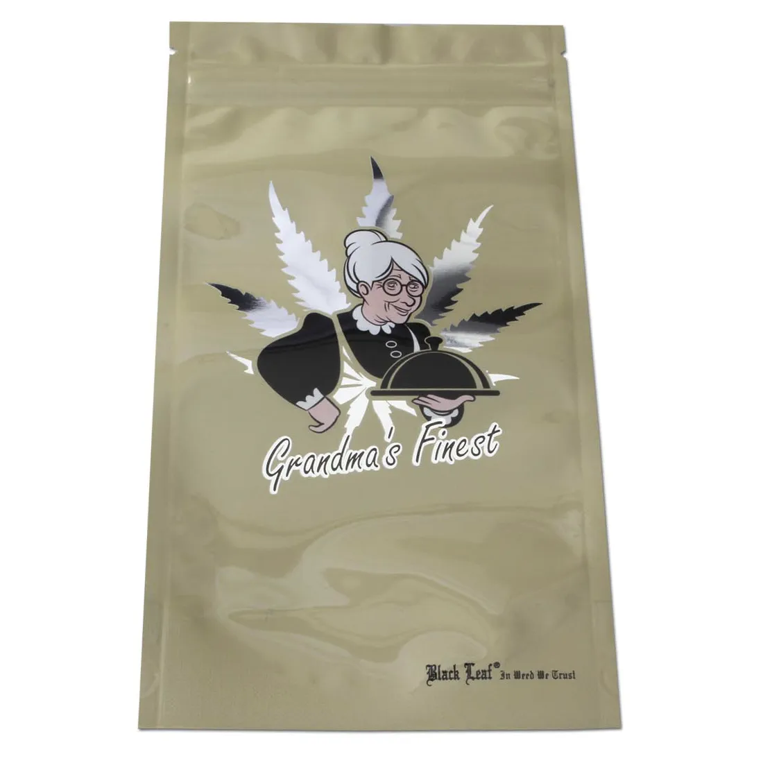 Opbevar dine urter og snacks på bedst mulig vis, med Black Leaf’s mindre udgave af “GRANDMA’S FINEST” Mylar Bag. Denne kompakte pose på 192 x 102 mm, er ideel til opbevaring af mindre mængder plantemateriale eller andet stash, og beskytter effektivt mod både lugt og fugt. Den er lavet af metalliseret polyesterfilm (mylar folie) som holder dine ting sikre og friske, samtidig med at den er genanvendelig og fødevaregodkendt. Perfekt til dem der ønsker en diskret og pålidelig opbevaring med et sjovt twist – Bedste ville helt sikkert godkende den!