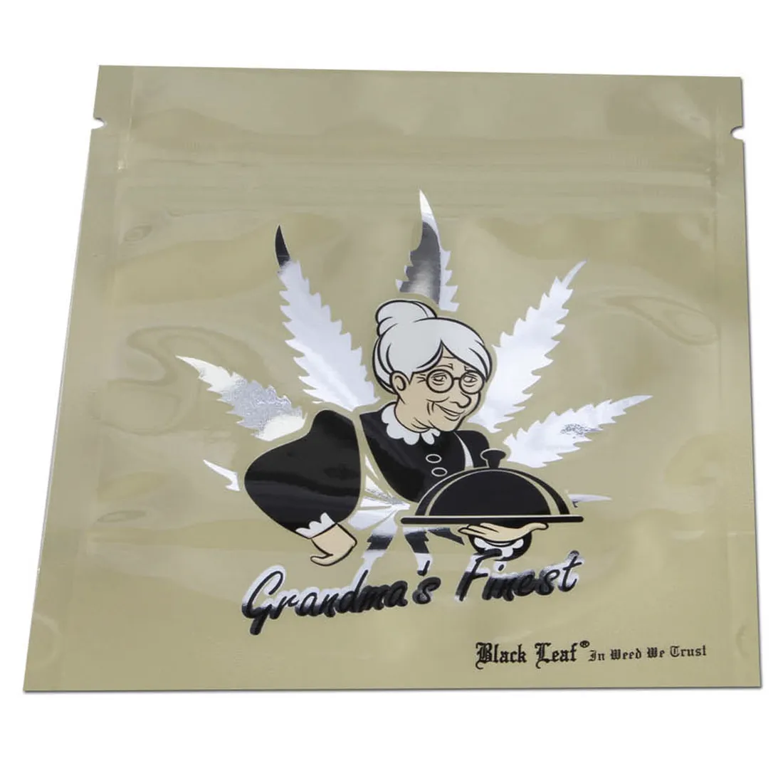 Opbevar dine mest elskede urter og snacks i stil, med Black Leaf’s “GRANDMA’S FINEST” Mylar Bag. Denne rummelige pose måler 224 x 190 mm, og er lavet af metalliseret polyesterfilm, der sikrer at dine urter forbliver helt friske og beskyttede. Med sit nostalgiske “grandma” motiv, og en solid, lufttæt lynlåslukning, er posen både lugtsikker og fødevaregodkendt, og dermed ideel til alt fra friske urter til frokostens delikatesser. Den kan bruges igen og igen, hvilket gør den både miljøvenlig og lige så pålidelig som bedstemor selv!