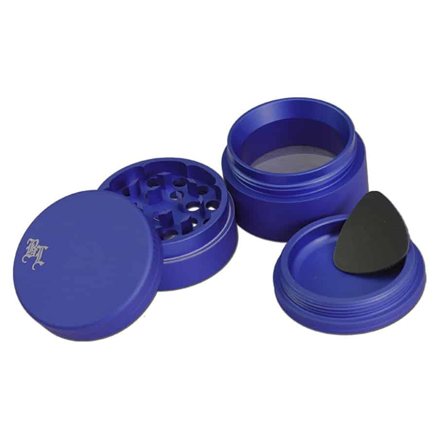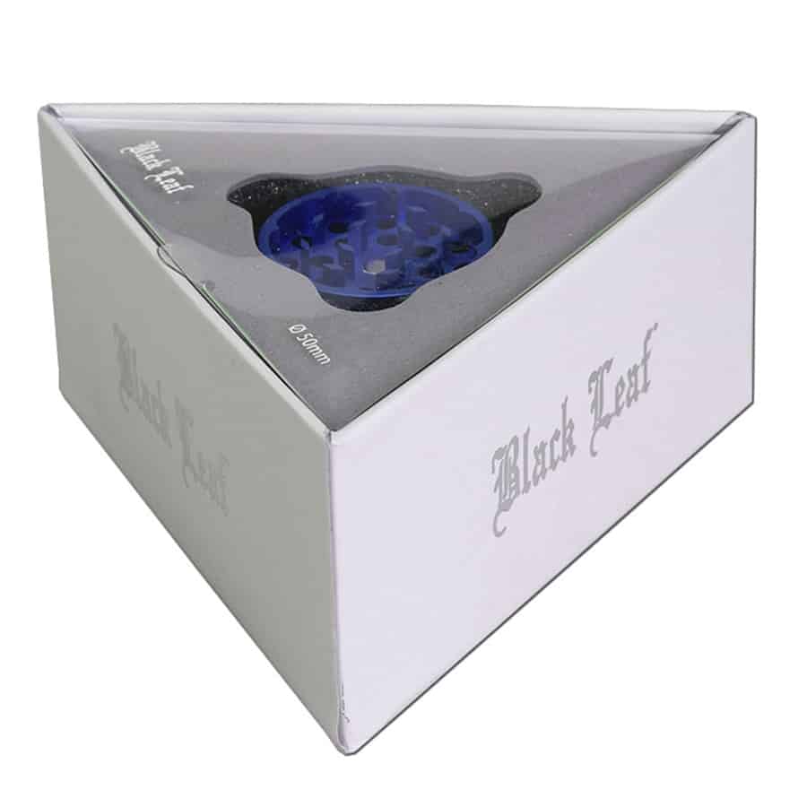Denne metal grinder fra Black Leaf, er fremstillet af aluminium af højeste kvalitet. Den kommer med et mat overflade i en blå farve, hvilket sammen med det lille Black Leaf logo på toppen, giver den et klassisk og stilfuldt look. Grinderen er 4-delt med 3 rum i alt, og har skarpe tænder med diamantform, der giver et fint kværnet slutprodukt. Der medfølger en opsamlingsske til det overskydende ryst i bunden af grinderen, og den kommer med en stærk magnet i låget, som sikrer af delene sidder tæt sammen. Bliver leveret i en fin Black Leaf æske, der gør den ideel som gaveide, og fås desuden i flere farver.