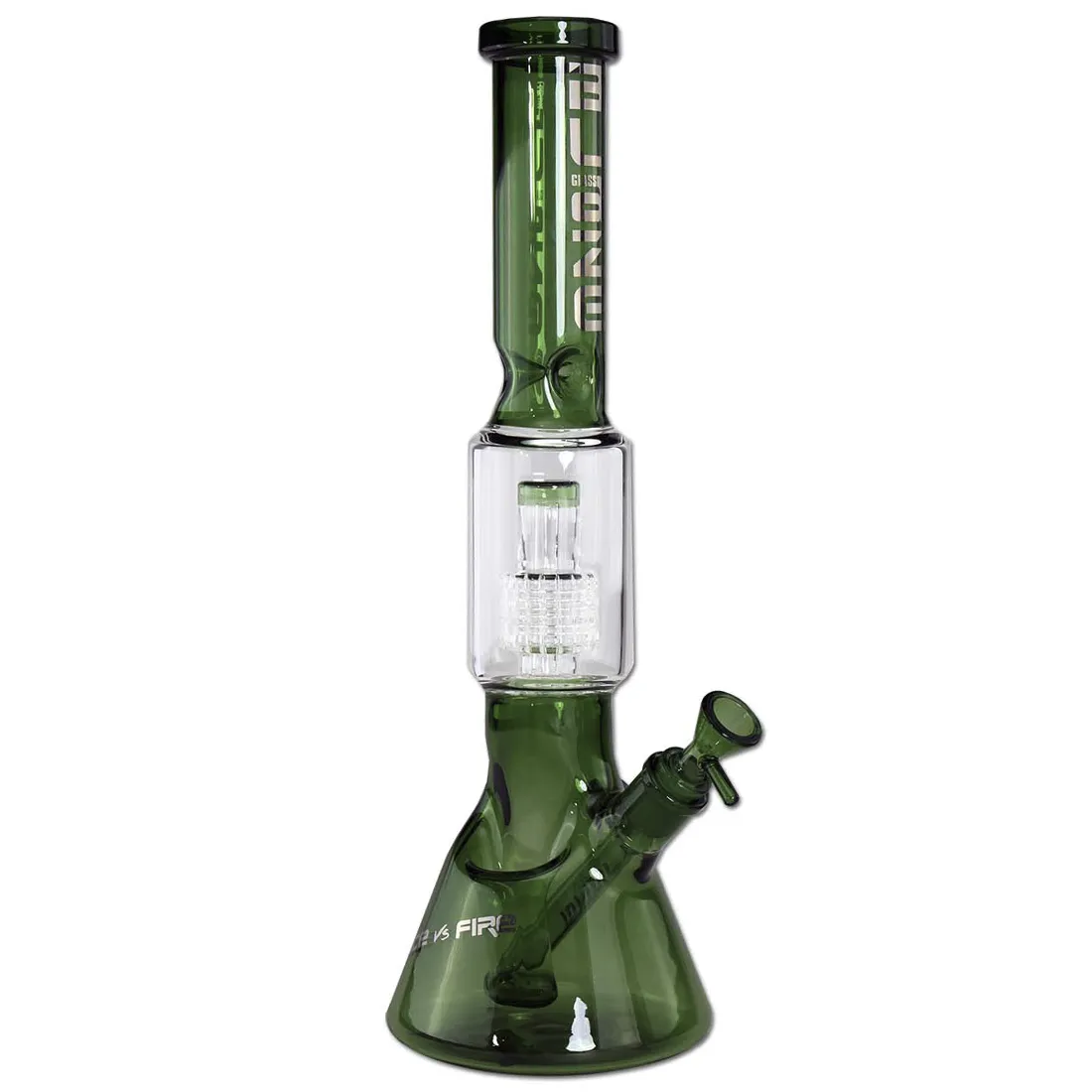 Denne Ice vs. Fire bong fra Blaze Glass er fremstillet i en elegant lys grøn nuance, og bringer rygeoplevelsen op på et helt nyt niveau, med sin smarte funktionelle og stilfulde konstruktion, fremstillet i 5 mm borosilikatglas. Den har en højde på 40 cm, der giver den god kapacitet til afkøling og filtrering af røgen, hvilket resulterer i en mere blød og ren inhalering. Den er designet med en drum percolator, som skaber en turbolent strøm i røgen, og sammen med is-fangeren langs halsen, der der giver dig mulighed for at få ekstra køling med isterninger. Derudover har bongen et sliphul på siden, med en praktisk tilhørnede silikoneprop, som både gør den nemmere at rengøre, og gør at du også nemt kan bruge bonghoveder med hank, hvis du foretrækker at ryge på den måde.Der er også tilføjet en smart lighter-holder på foden af bongen, så du altid har din lighter lige ved hånden (bemærk dog at Clipper-lightere desværre ikke passer perfekt i holderen). Vi anbefaler at bruge en rist på 10-12,5 mm til denne bong.