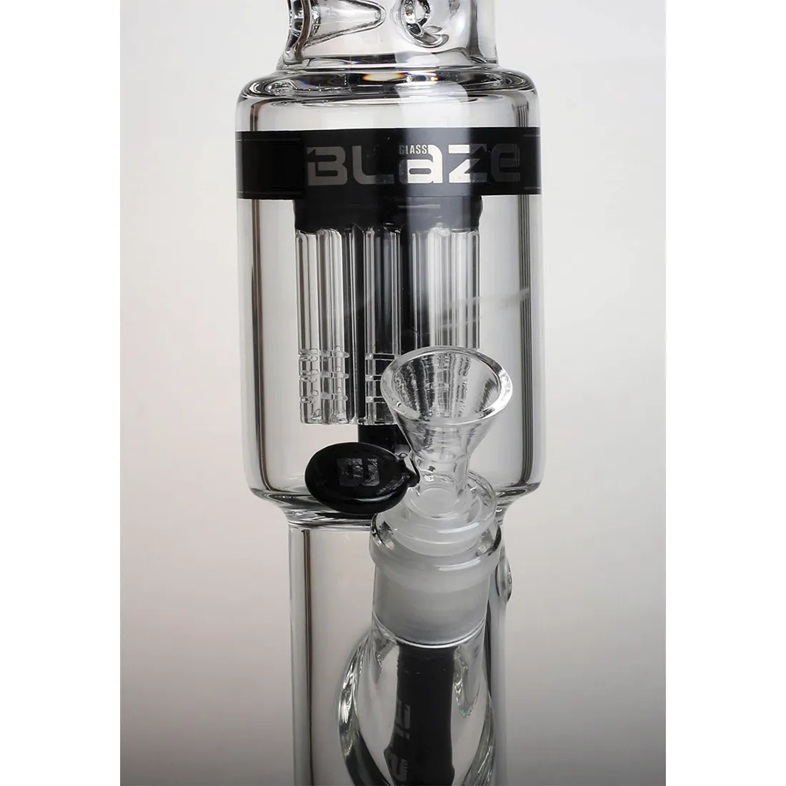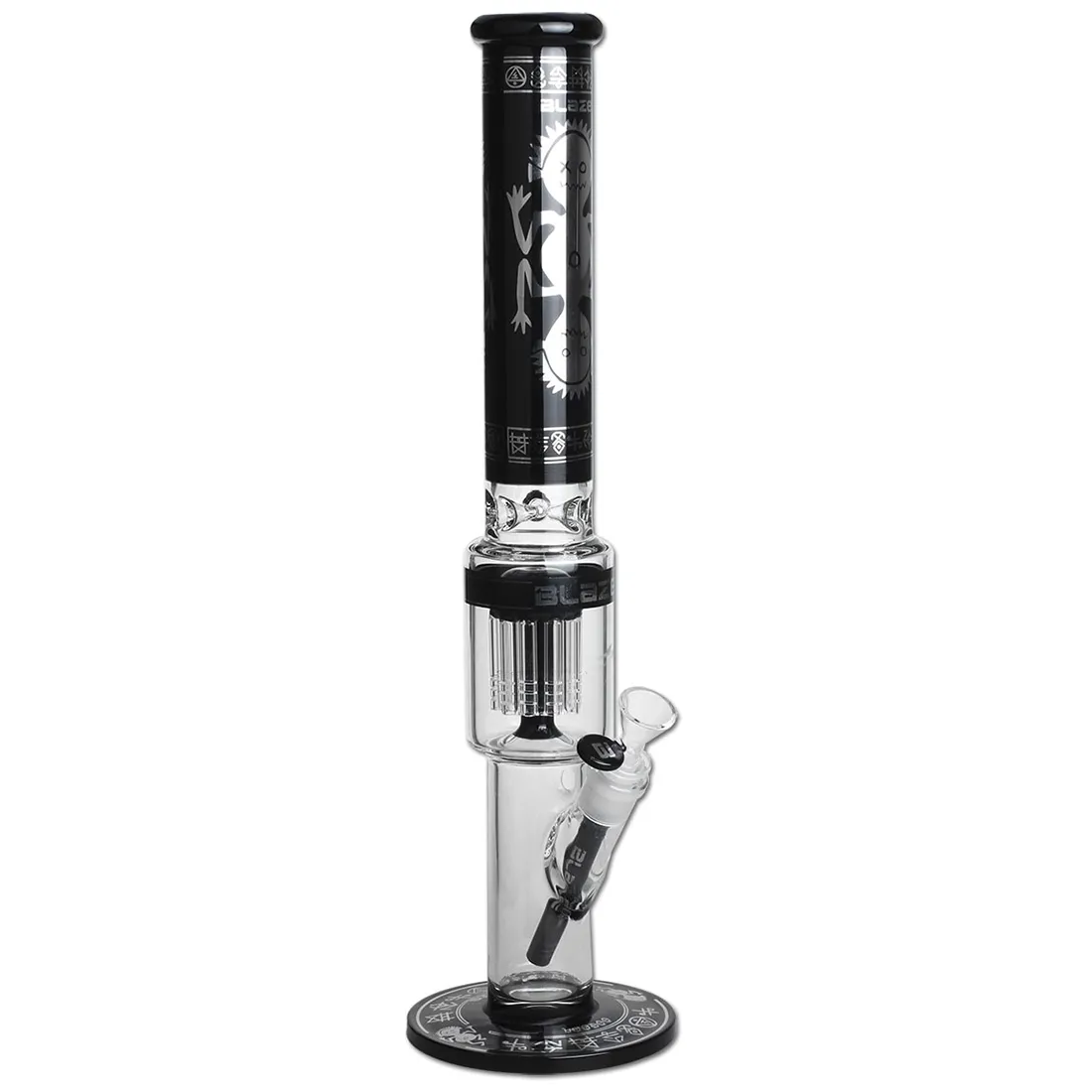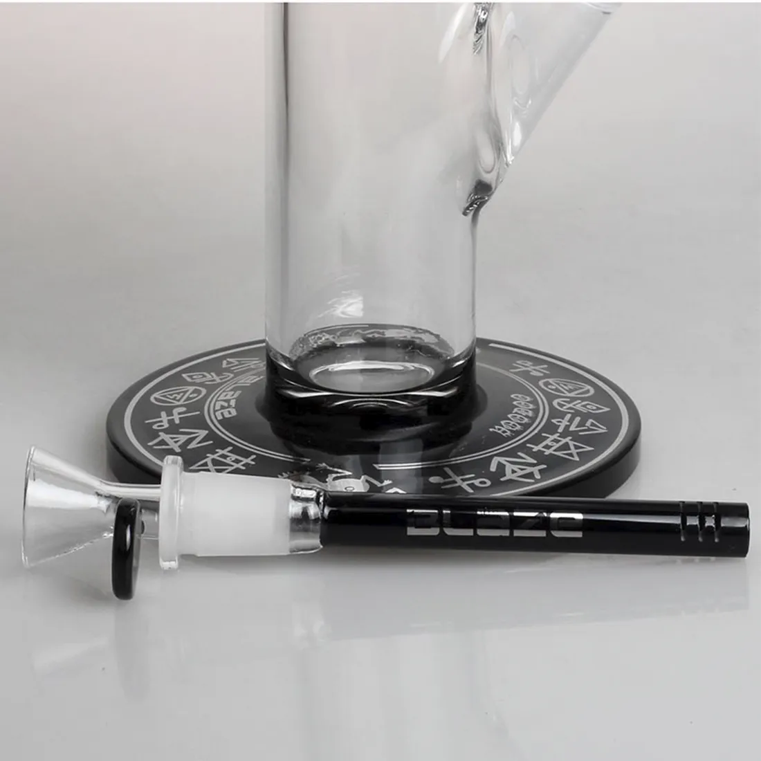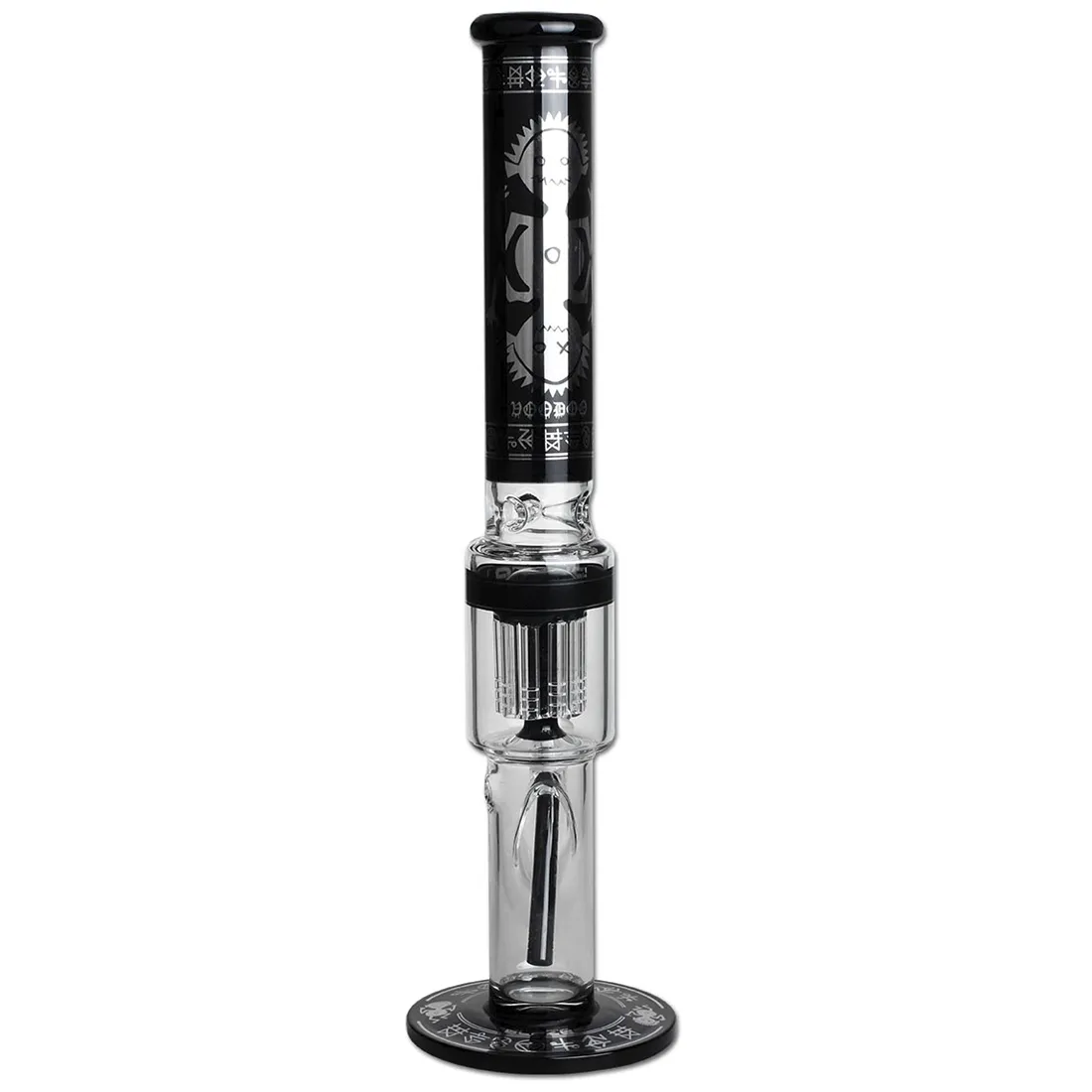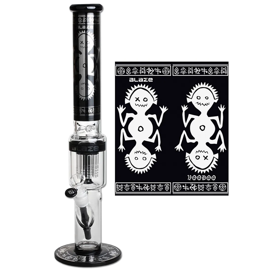 Denne Vodoo 10-Arm Percolator Bong fra Blaze Glass, er en bong skabt til den kræsne ryger, der ønsker både stil og gode funktioner i samme sug. Denne håndlavede model kombinerer teknisk finesse, med et dragende og mystisk design. Det dybsorte varmesikret borosilikatglas, giver en sofistikeret kontrast til det metalliske vodoo-print, som pryder både basen og halsen.Bongen kommer med en kraftfuld 10-armet percolator, der effektivt fordeler røgen gennem vandet, og dermed sikrer en blød og filtreret rygeoplevelse. Slamrøret kommer med slidsdiffusers, der giver et ekstra behageligt bobleflow og køling, mens isfangeren op langs halsen giver dig mulighed for at tilføje en solid mængde isterninger, hvis du ikke kan få køling nok.Bunden er bred og rund, og sikrer god stabilitet under hver session. Derudover kommer den med en praktisk hank med rulle-stop funktion på bonghovedet, og et komfortabelt afrundet mundstykke, der gør inhaleringen ekstra behagelig. Vi anbefaler en rist på 10-12,5 mm.