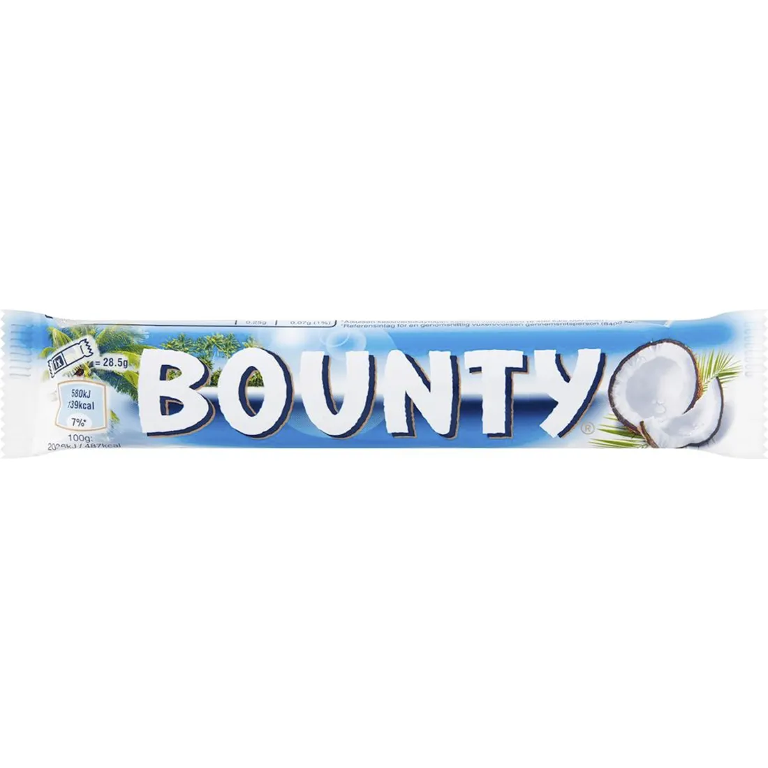 Mærk den tropiske nydelse med en Bounty chokolade bar! Disse ikoniske chokoladebarer indeholder en lækker blød kokosfyldning, indkapslet i silkeagtig mælkechokolade. Hver pakke kommer med to kokosbarer, så du kan nyde en nu og evt. gemme den anden til senere. Med den perfekte kombination af sød kokos og cremet chokolade, er Bounty den ideelle snack på farten.Opbevaring: Tørt og køligt.Bemærk: Kan indeholde spor af nødder og gluten.