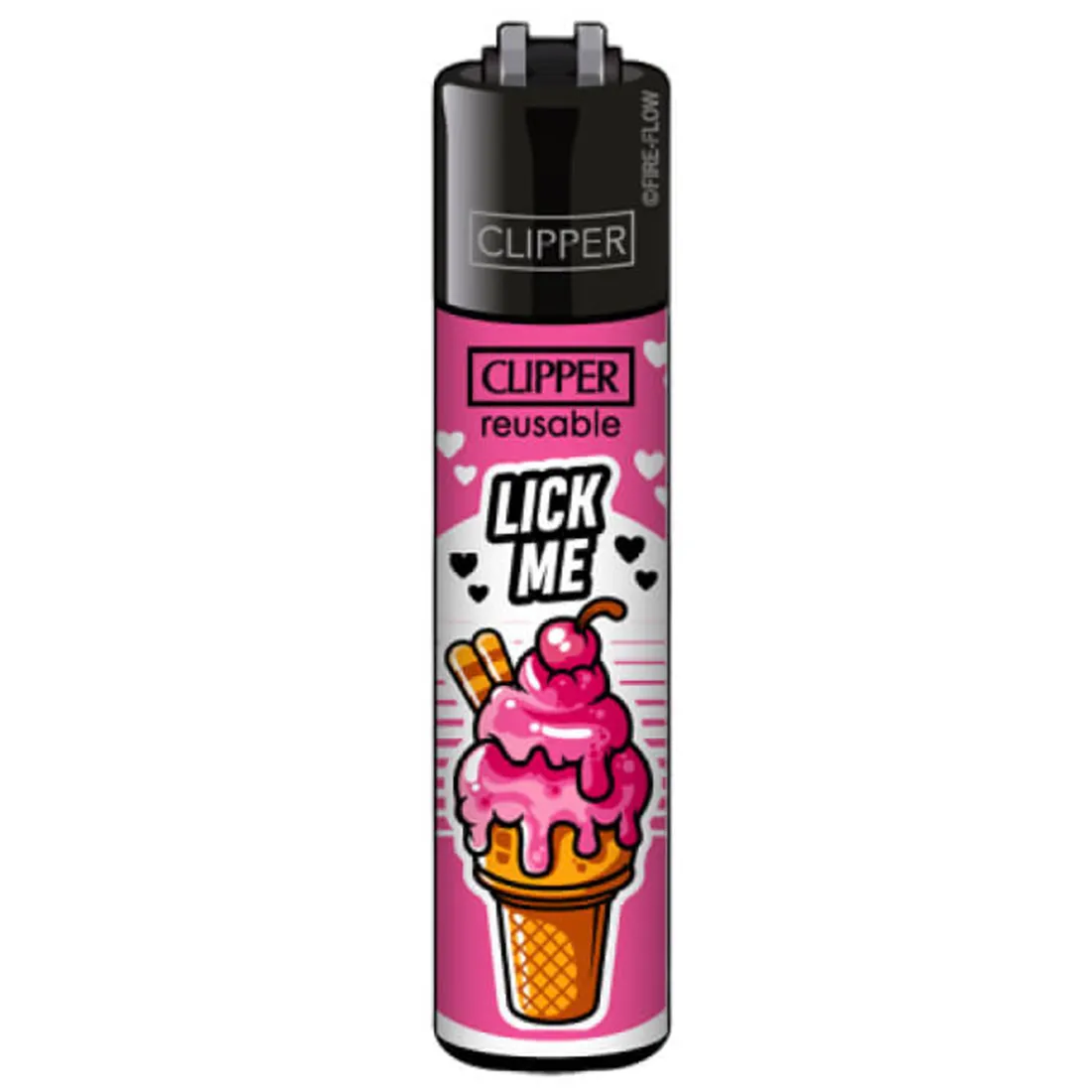 Clipper “Lick Me” er en lighter, der skiller sig ud med sit frække og farverige design, perfekt til den voksne Clipper kollektion. Den lyserøde baggrund, små hjerter og den overdådige isvaffel med kirsebær på toppen, giver den et legende og humoristisk udtryk, som er svært ikke at lægge mærke til. Som altid får du den klassiske Clipper kvalitet med en rund form, der ligger godt i hånden, en stabil flamme, og muligheden for at fylde den op igen og igen. Flinten kan udskiftes, og holder du lighteren skråt, får du flammeboostet, perfekt til både bong og pibe, hvor der skal lidt ekstra ild til.