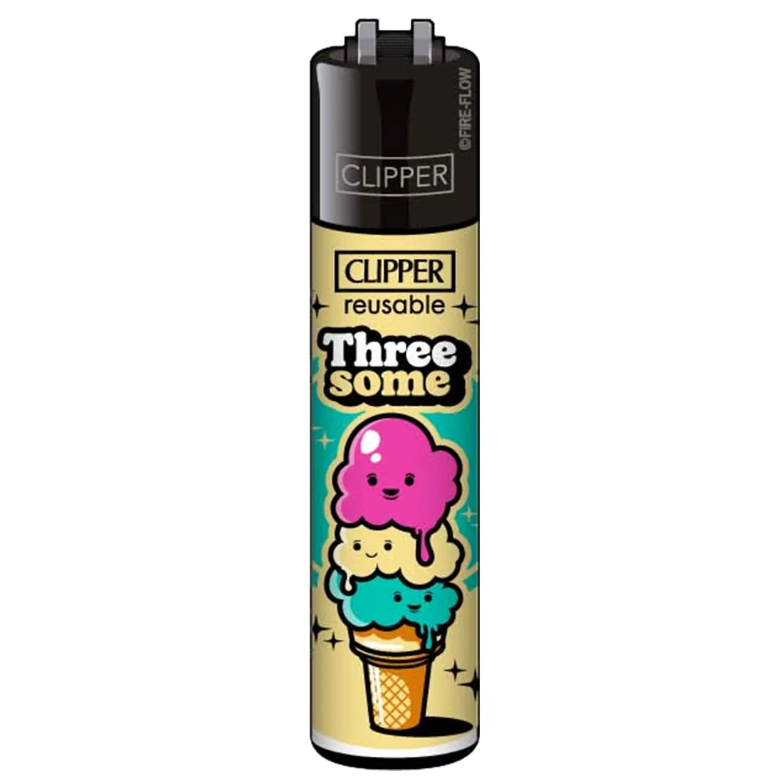 Clipper “Threesome” er en humoristisk lighter med et sødt motiv af en tredobbelt isvaffel, hvor tre kugler med glade ansigter smelter ned ad siden. Designet balancerer perfekt mellem nuttet og frækt, noget til kun de voksne kollektioner. Den ikoniske Clipper form gør, at lighteren ligger godt i hånden og leder varmen væk fra fingrene, så du kan bruge den komfortabelt, selv når du rister over længere tid. Du får en stabil flamme uden soden, og som altid kan den genopfyldes med gas, og holde endnu længere med det udskiftelige flintsystem. Vipper du lighteren på skrå, får du det velkendte flammeboost, ideelt til bong, pibe eller optænding når det blæser.