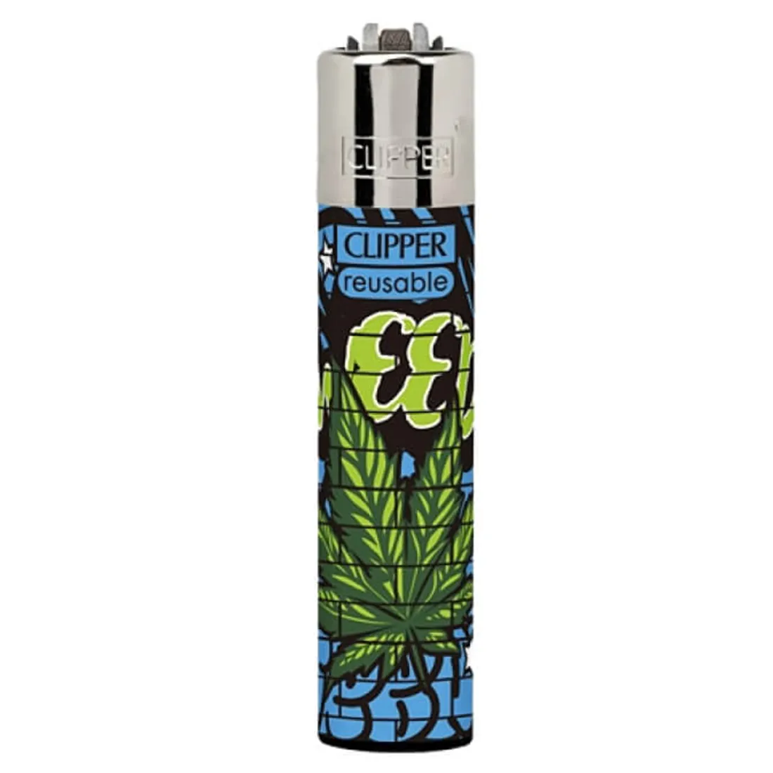 Urban Weed Clipper er en lighter der bringer gadens energi lige ind i din hånd. Med en klar blå baggrund, et massivt grønt blad og sorte grafitti-detaljer, ligner den et lille stykke streetart, du kan tage med overalt. Den er både rå og farverig, og et oplagt valg, hvis din lighter også skal være med på gaden. Clipper leverer som altid kvalitet: rund form der er rar at holde om, en ren og stabil flamme, og muligheden for at fylde den op igen. Flintsystemet kan skiftes, så den holder længere, og med flammeboostet aktiveret på skrå, får du ekstra ild til bong og pibe, pålidelighed når det virkelig gælder.