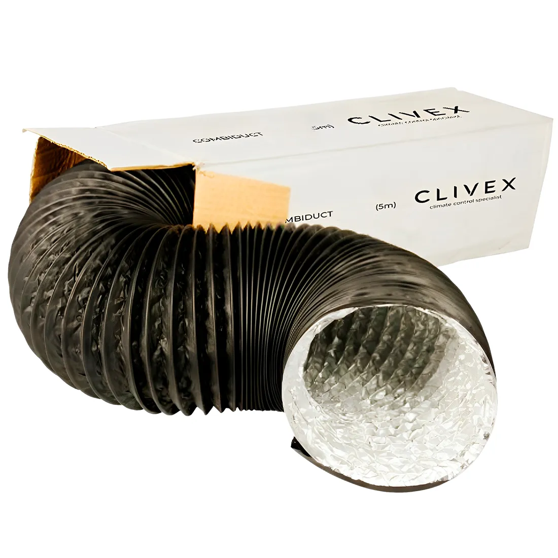 Clivex Combi Flexrør i 152 mm er et kraftigt og fleksibelt ventilationsrør, designet til effektiv luftudskiftning i mellemstore grotelte og ventilationsanlæg. Røret kombinerer et indvendigt lag af aluminium med et ydre lag af PVC, forstærket af en indvendig stålspiral, som giver en stabil og støjsvag luftføring, selv ved højt lufttryk.Den dobbelte konstruktion reducerer støj og vibrationer markant, og gør det muligt at opretholde et effektivt luftflow gennem hele systemet. Clivex Combi Flexrør 152 mm kan nemt monteres med spændebånd eller ventilations-tape, og passer direkte til standardtilslutninger på udsug, filtre eller ozongeneratorer.Takket være den fleksible struktur kan røret tilpasses præcist til anlæggets behov, og bøjes uden at miste styrke eller luftgennemstrømning. Det er et driftssikkert og økonomisk valg til både professionelle og private opsætninger, hvor stabilitet og lavt støjniveau er afgørende.Bemærk : Ikke egnet til transport af varm luft fra cooltube reflektorer. For yderligere støjdæmpning anbefales et lydisoleret rør.