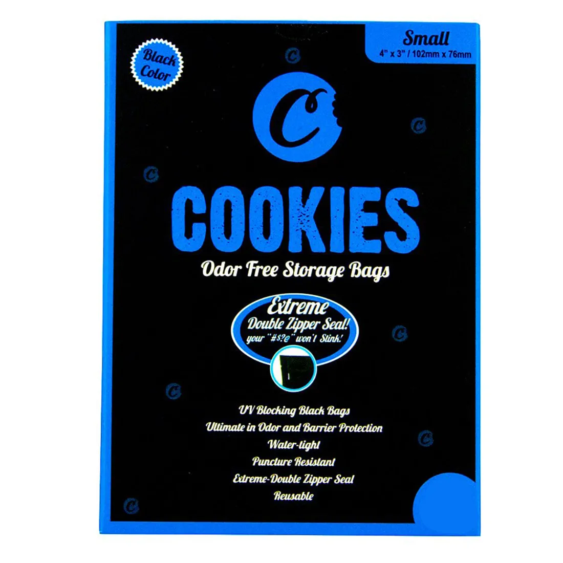 Producent : CookiesType : Lugtfri LynlåsposeMateriale : UV-blokerende sort plastikStørrelse : 102 × 76 mmFarve : SortAntal : 1 stk