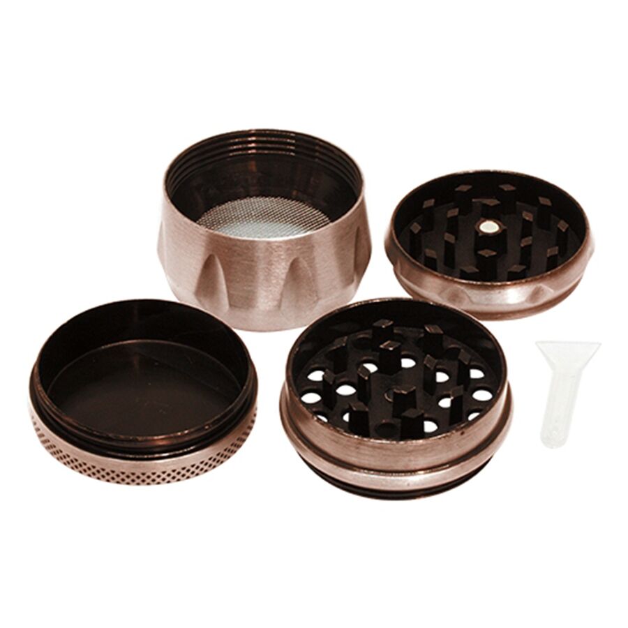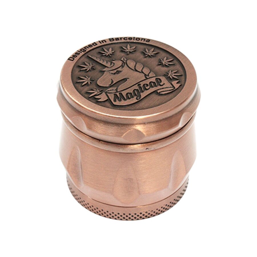 Denne bronzefarvet grinder kommer i fire dele, og med en tilhørende opsamlingsske til det fint sorterede i bunden af de 3 rum. Den har en enhjørning med teksten: Magical, som motiv på toppen af grinderen, og selvfølgelig med en masse små hampeblade også. Den har ekstra skarpe tænder, som giver en let friktion på grinderen, så længe du husker at holde den lodret, da der ellers kan komme plantemateriale ned imellem delene, og forringe friktionen. En måde at slippe af med dette på, er ved at købe egnet grinder rens, sammen med en Ninja Star Grinder Tool, som er en god hjælpende hånd til rengøring af din grinder, begge kan findes i samme kategori, og er noget vi selvfølgelig vil anbefale at tilkøbe, så du kan vedligeholde det pæne udseende på din grinder i lang tid.