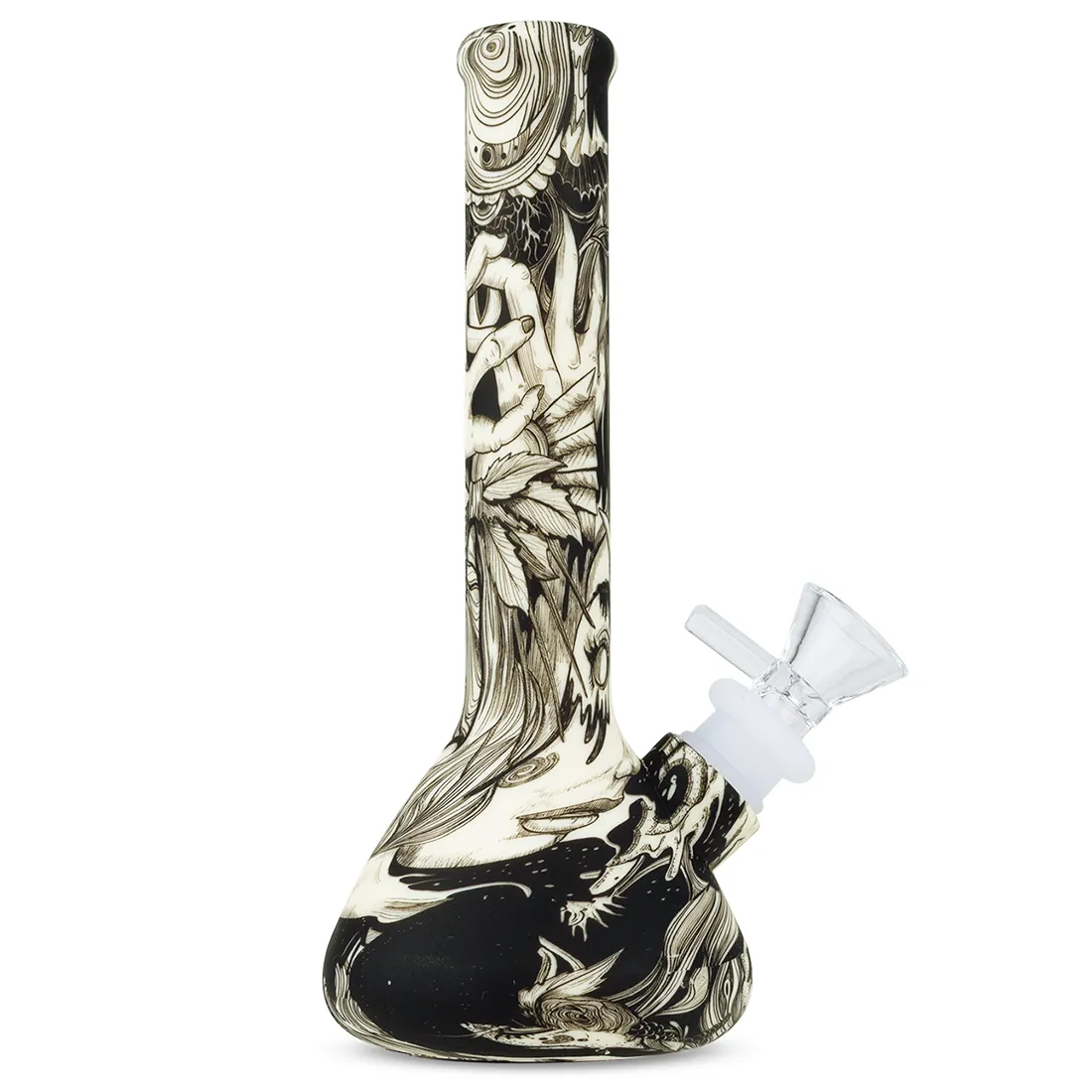 Euphoria Mystical Bong på 19 cm bringer et spil mellem sort og hvid, der får den til at ligne et lille stykke magi på bordet. Den er lavet af fleksibel silikone, som nærmest ikke kan gå i stykker, og tåler både stød, fald og lidt hårdhændet brug uden problemer. En bong der både ser cool ud, og holder til lidt af hvert.Det sort-hvide mønster giver den et rent og elegant udtryk, samtidig med at materialet gør den let at tage med i tasken, rygsækken eller bare på tur. Silikonen er lugtafvisende, nem at rengøre, og holder sin form uanset hvor mange gange du bruger den.Slamrøret er fremstillet af silikone, og bruger et 14,5 mm glasbonghoved med hank, så røgen trækkes frit og jævnt igennem. Trods størrelsen leverer den et fast og behageligt sug, perfekt til hurtige sessioner, når du vil have noget der bare virker og holder. Vi anbefaler at bruge en rist på 10-12,5 mm til denne model.