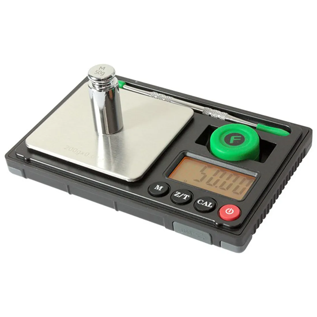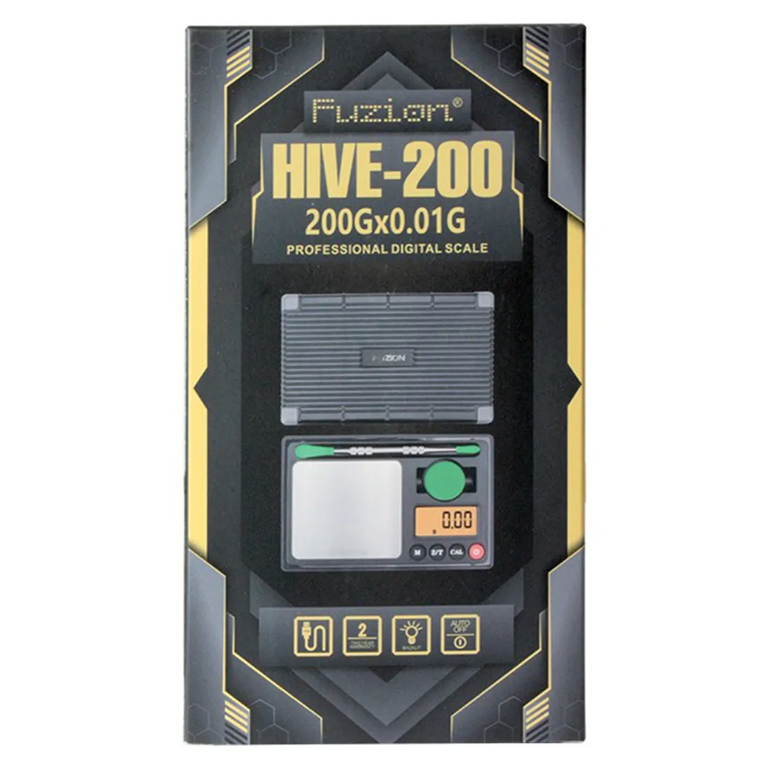 Fuzion Hive er en lille digital lommevægt, der kommer med en række ekstra tilbehør, herunder en 50 grams vægtlod, en arbejdsbakke i form af låget, en non-stick måtte til vejning af olier, en BHO dabber, en silikone beholder samt et USB-kabel og en brugervejledning + garantikort på 2 år. Den har en kapacitet på 200 gram og er præcis til 0,01g (2 decimaler) hvilket gør den ideel til at veje mindre mængder af materialer. Med dens indbyggede genopladelige USB-strømkilde, og auto-off funktion der sørger for at slukke vægten efter 180 sekunders inaktivitet for at spare på batteriet, er Fuzion Hive både praktisk og energieffektiv. Dens kompakte størrelse og praktiske dabbing pose gør den perfekt til at tage med på farten sammen med dit dab-rig.