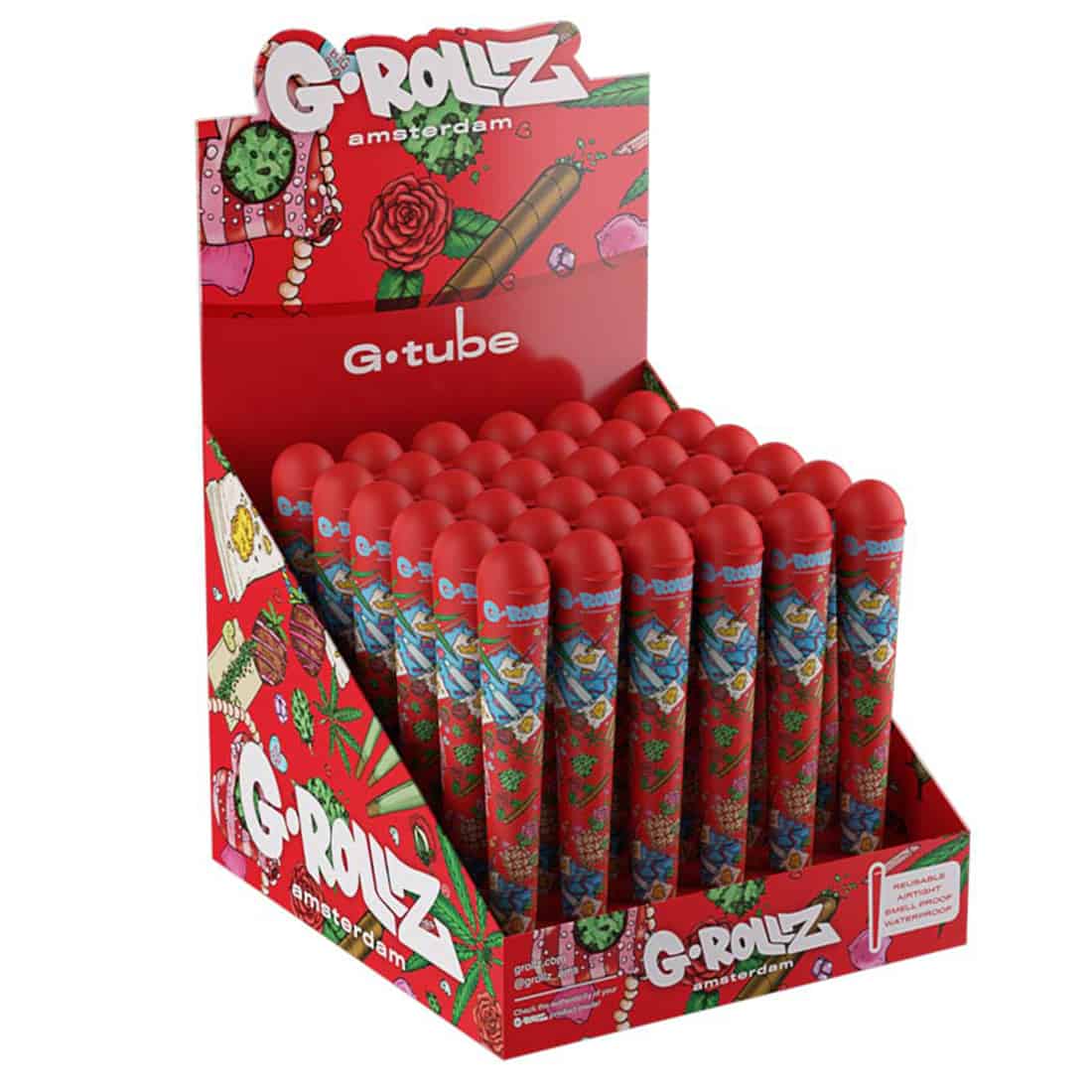 Vi præsenterer her G-Rollz Amsterdam Cone Holder, det perfekte hylster til at opbevare dine joints på farten. Dette robuste og holdbare rør er lavet af solid plastik af høj kvalitet, hvilket betyder, at det kan tåle tæsk, og vil derfor også holde i lang tid. Den lufttætte hætte sikrer, at din joint forbliver frisk og tør, mens låget giver dig mulighed for hurtigt at kunne kvæle ilden efter din rygning. Så uanset om du er hjemme eller på farten, er dette flotte Amsterdam hylster den perfekte måde at opbevare dine joints sikkert og forsvarligt på.