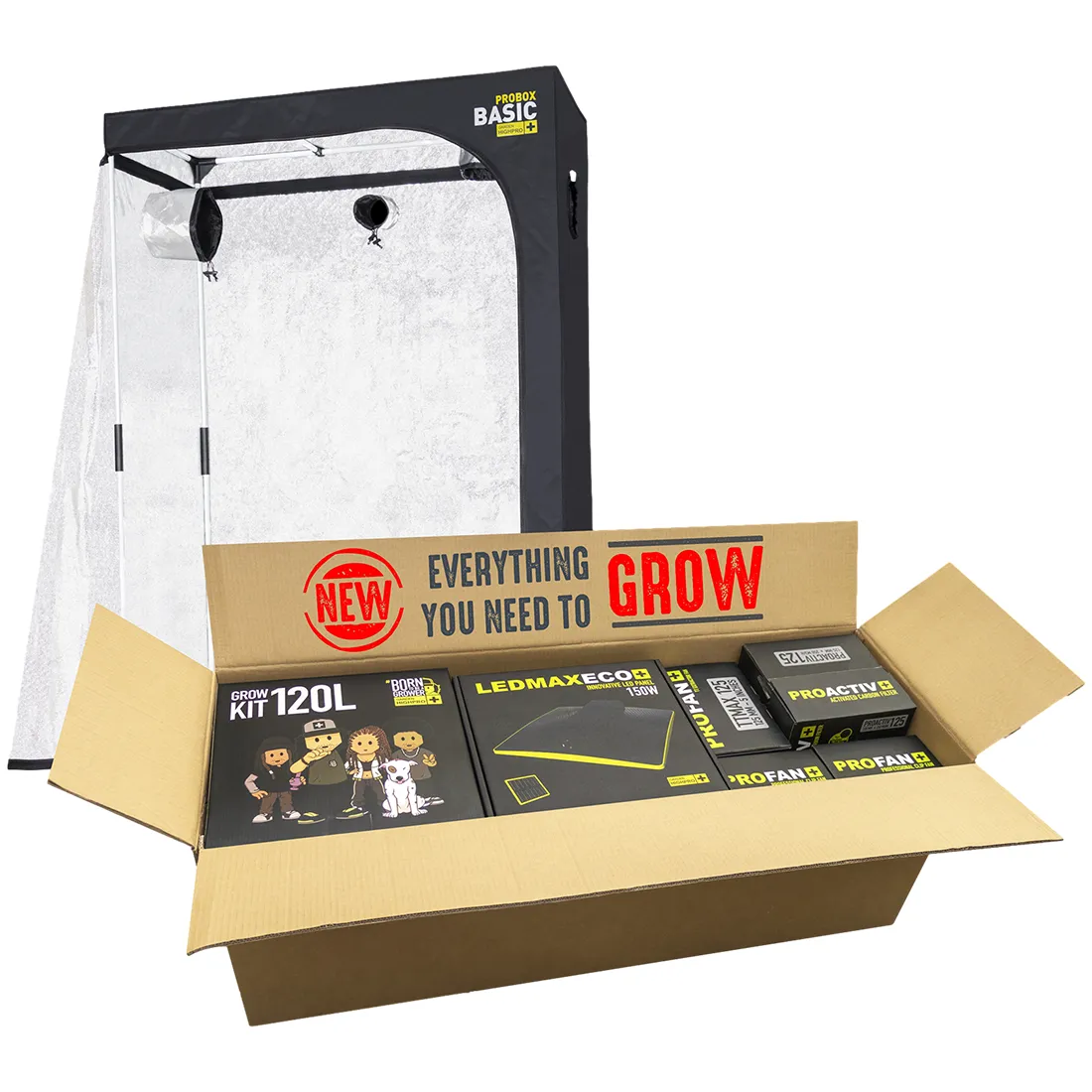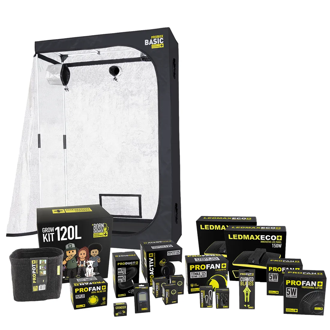 Garden HighPro Grow Kit 120L giver dig et komplet og afbalanceret gro setup, til dig der vil have et lidt bredere telt med plads til flere planter. Med teltmål på 120 x 60 x 180 cm får du god plads til planterne, og et stabilt miljø hvor du kan styre lys, luft og klima fra start til slut.Lyset leveres af to LEDMAXECO 150W lamper, som imiterer solens spektrum, og giver effektiv belysning uden at udvikle for meget varme. Ventilationssystemet består af to Profan cirkulationsblæsere, en TTMAX 125 mm udsugning, samt en Profan Inline 125 mm indblæsning, så luftstrømmen altid holdes i balance. Sammen med et Proactiv kulfilter på 250 m³/h, sikres et friskt og lugtfrit miljø.Der medfølger fem 11 liters Propot geotekstilpotter, samt et Prohygro Basic termohygrometer til at overvåge temperatur og fugt. Kittet inkluderer også tre Tempro timers, Prohanger XL ophæng, Lighthanger og en Procut saks. Som bonus finder du en Magic Box med grinder, dyrkningsguide og sticker. Alt i alt et komplet sæt, hvor du kun skal tilføje jord og frø for at komme i gang.