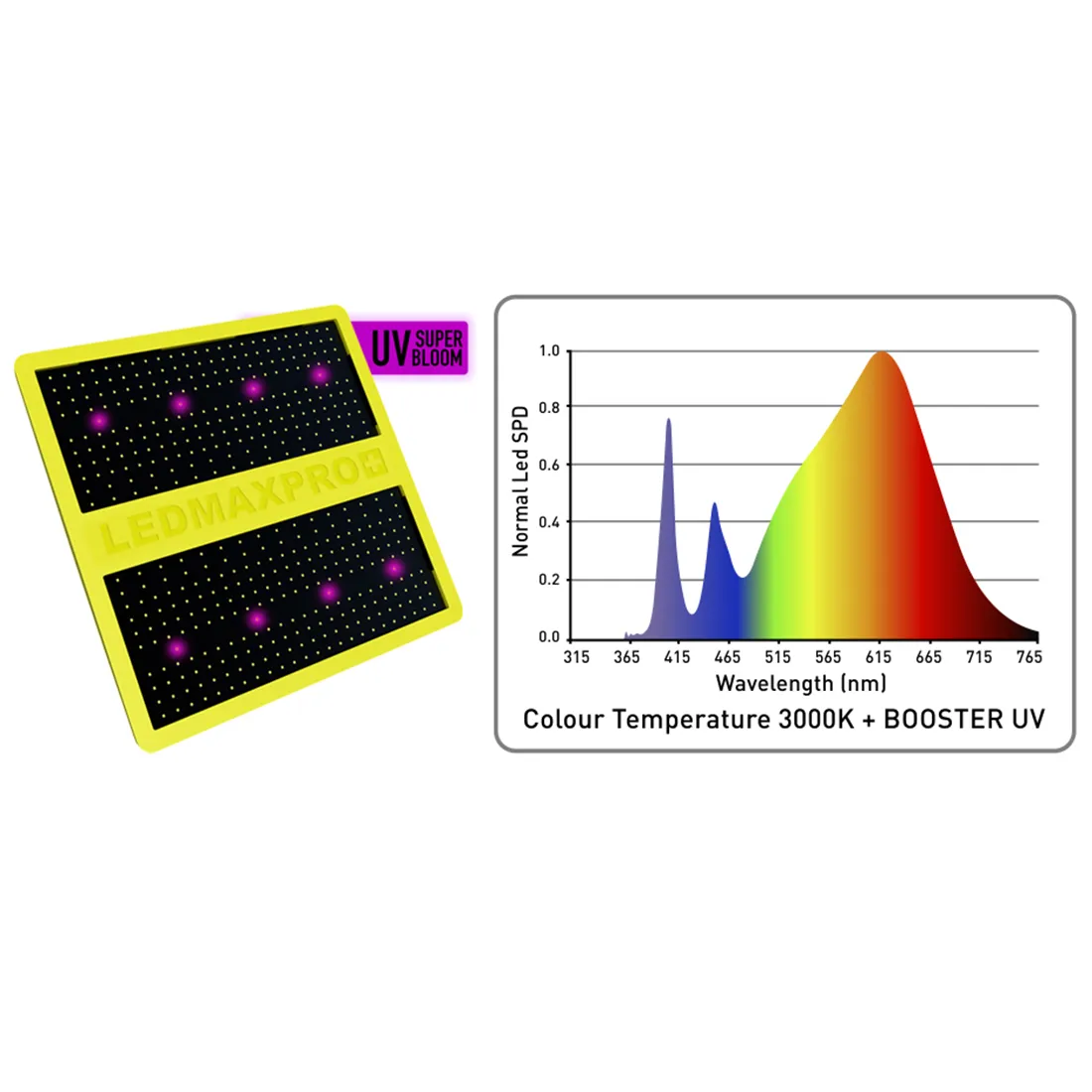 Garden HighPro LEDMAXPRO Super Bloom på 300 watt, er udviklet til alle der vil give sine planter optimale forhold i hele vækst- og blomstringsfasen. Denne LED lampe giver en høj ydeevne med et lavt strømforbrug og et spektrum, der dækker plantens komplette livscyklus, lige fra tidlig vækst og til fuld blomstring.Lampen leverer et fuldt spektrum på 3000K med 224 LM82B LED’er og 4 Seoul Viosys UV-dioder på 405 nm, som stimulerer kraftigere vækst og mere intens blomstring. Det dæmpbare kontrolhjul giver dig præcis styring over lysstyrken, så du nemt kan tilpasse intensiteten til plantens behov i hver fase.Med et lavt varmeoutput og fugtafvisende konstruktion sikrer LEDMAXPRO et stabilt og sikkert miljø uden risiko for varmepåvirkning eller kondens. Plug & Play-designet gør den nem at installere, og den brede lysvinkel på 120° giver jævn dækning af hele dyrkningsområdet.Med en effektivitet på 2,06 µmol/J og et PPF-output på hele 627,7 µmol leverer lampen stærk lysudbytte til lavt energiforbrug. Med en levetid på over 60.000 timer får du en løsning, der både er driftssikker og økonomisk på lang sigt.