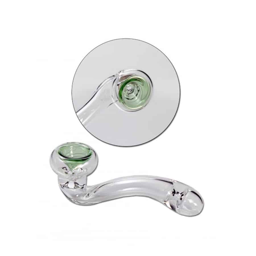 Denne glas pibe er håndlavet af varmeresistent glas, og kommer med et sliphul på siden af piben. Den har en grøntfarvet skål, og egner sig ideelt til at ryge ren friskkværnet plante uden tobak. Vi anbefaler dog alligevel at bruge en piberist på 10-12 mm. Den findes også i andre farver end grøn.