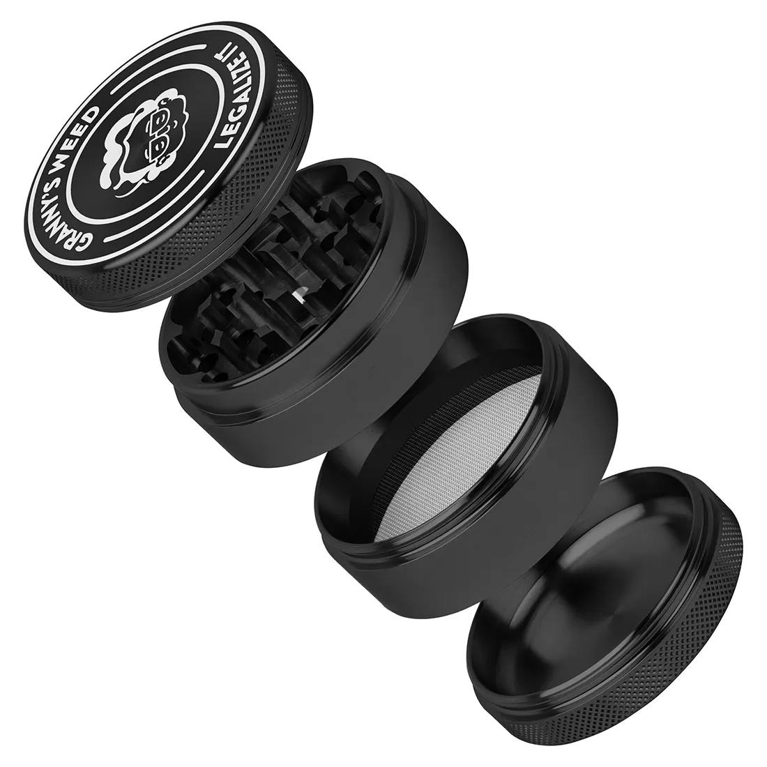 Denne “Legalize It” grinder fra Granny’s Weed er en klassisk funktionel grinder til dit daglige grind. Med sin standard diameter på 55 mm, og en højde på 43 mm, er den perfekt til dem der ønsker en pålidelig, mellemstor grinder, der giver et finkværnet resultat som er ideel til joints. Den er let at have med på farten, og er fremstillet i robust aluminium i et en sort farve, og med gravering af Grannys logo og “Legalize It” på låget.Grinderen er udstyret med skarpe diamantformede tænder, der sikrer et fint kværnet resultatat, så godt og effektiv, at det faktisk er denne vi anbefaler, så tag ikke fejl, selvom den ligner de andre modeller, så får du virkelig et godt resultat med denne model.Den magnetiske lukning i låget holder delene sikkert sammen under brug, mens de tre adskilte kamre gør at det overskydende ryst / pollen samler sig i bunden, der nemt kan opsamles med opsamlingssken der medfølger. Den perfekte gaveide til den cannabisrygende bedstemor.