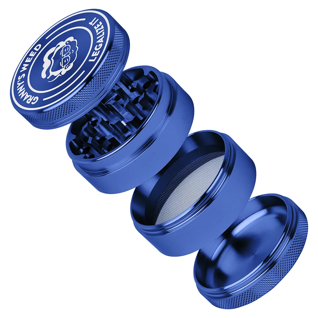 Denne “Legalize It” grinder fra Granny’s Weed, kommer i en dyb blå farve, og er lavet til alle bedstemødre, der gerne vil have noget der både fungerer godt, og samtidig ser ordentligt ud. Med sine 55 mm i diameter, og 43 mm i højden, får du en mellemstor grinder, der ligger godt i hånden, og som kværner urterne fint og jævnt, lige som det skal være når du gere vil rulle en god joint.Grinderen er fremstillet i aluminium, og har diamantformede tænder der kværner effektivt igennem plantematerialet, husk dog at sørge for konsistensen er tørt og rygeklar inden du grinder. Låget holdes sikkert på med en magnet, så du slipper for at skrue og justere, og så har den tre rum i alt, hvor det nederste fungerer som pollenfang til det overskydende ryst fra planten, hvor der selvfølgelig følger en lille ske med til opsamling. Så alt i alt en solid og enkel model, som vi klart kan anbefale! Den gør det den skal, faktisk så godt at vi ikke har set så fint et grind på denne type model før.
