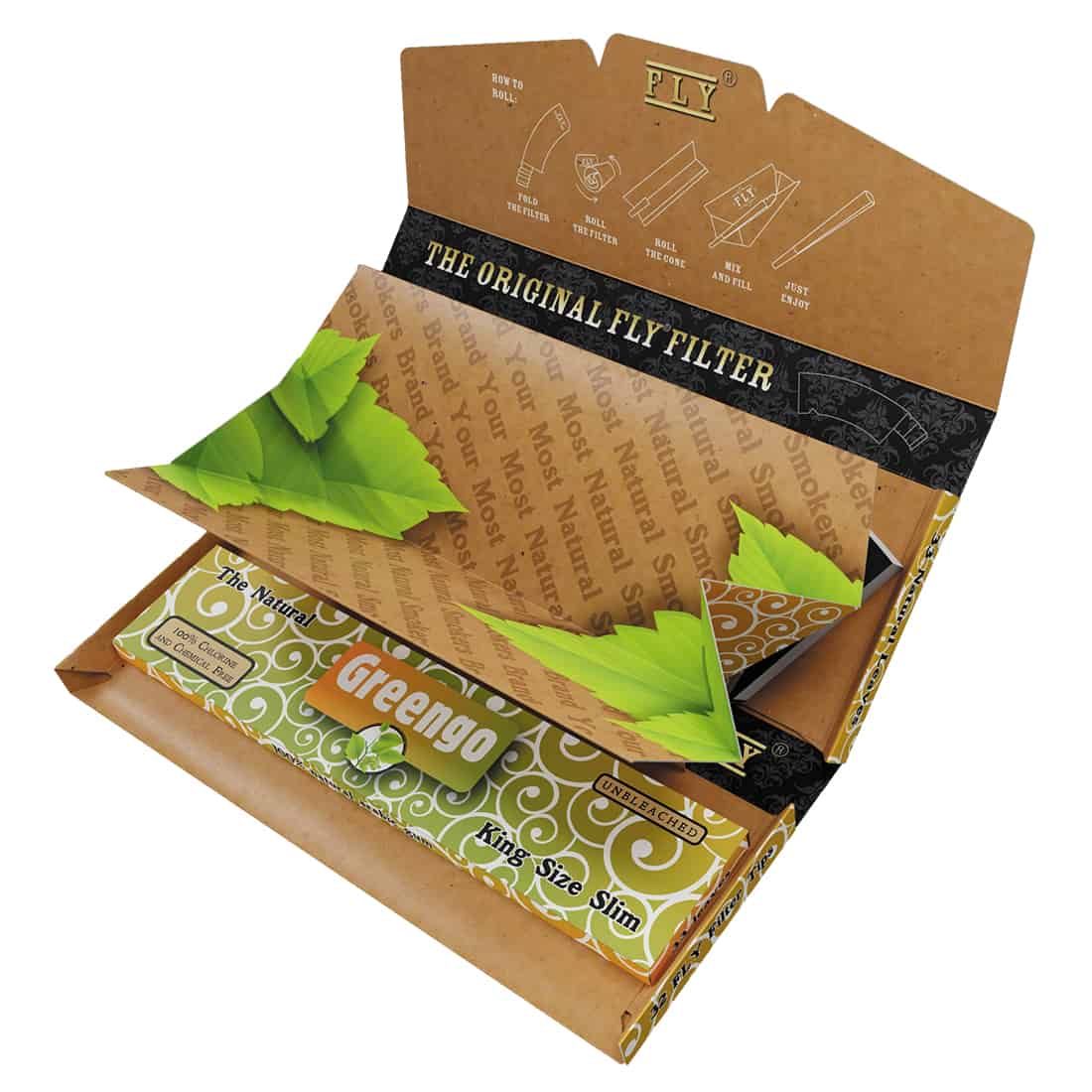 Greengos kombi-pakke kombinerer Greengo jointpapir og FLY-filtertips i én praktisk pakke. Fordi pakken har en indbygget mixerbakke i midten når du folder den, kan du nemt bruge den når du er på farten. Indeni er der en både Greengo King Size jointpapir og Black FLY-filtertips, som er ekstra store filtre. Black Silk er også koniske, hvilket giver mulighed for bedre form på jointen. De er også perforerede, så der kommer mere luft gennem filteret, samtidig med at de forhindrer tobak i at trænge ind i munden når du ryger. Greengo jointpapiret er fremstillet af ubleget FSC-certificeret papir, der er fri for klor og andre kemikalier. Der er brugt genbrugspapir til emballagen, og der er i alt 32 Greengo-papirer og FLY-filter i pakken.