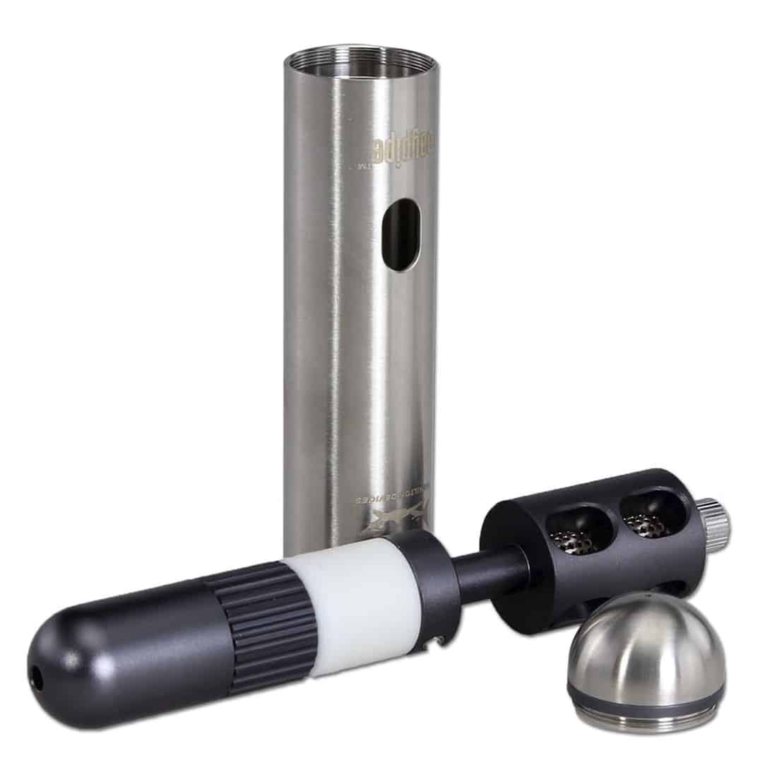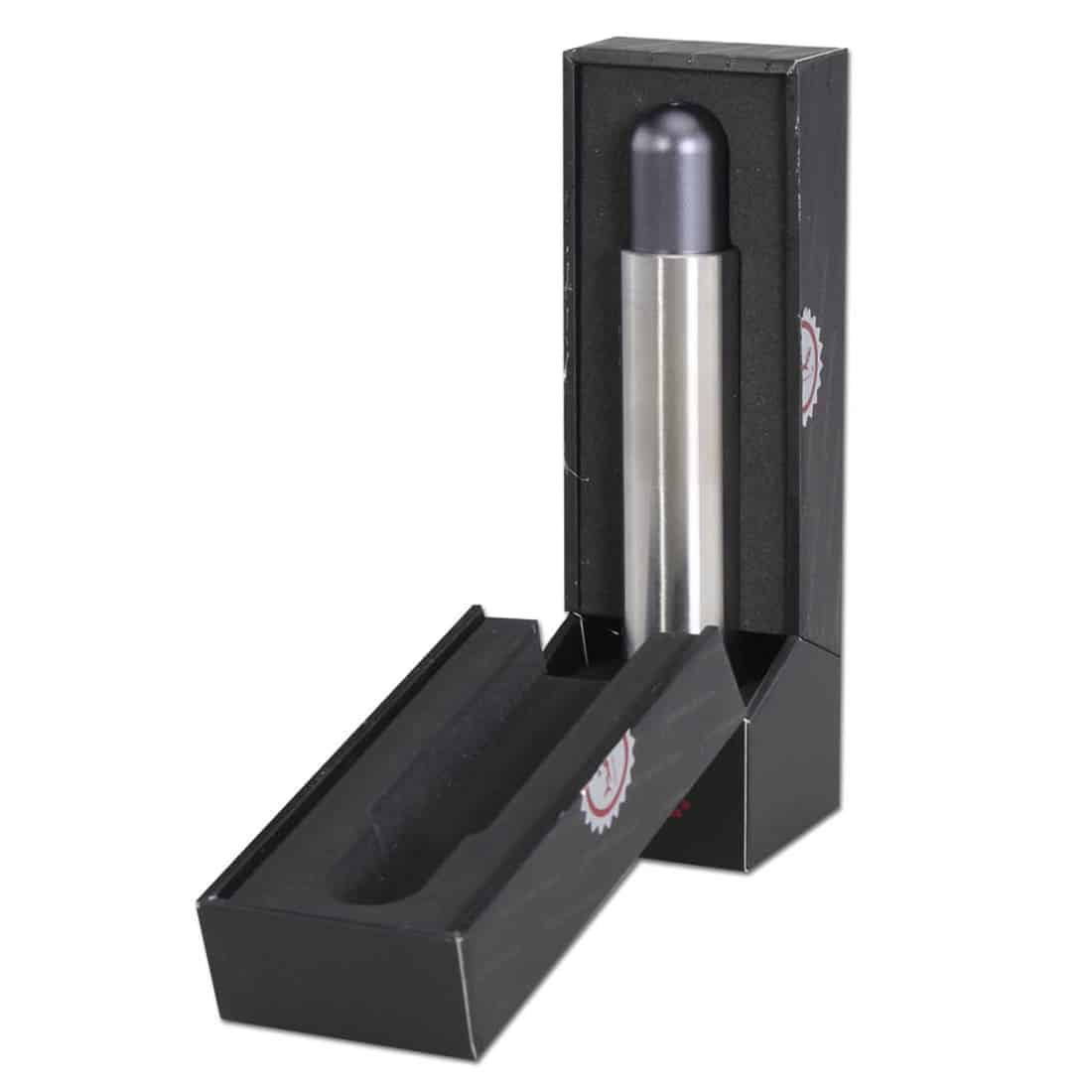 Denne Daypipe fra Hamilton Devices, er fremstillet af anodiseret rustfrit stål, og er ulastelig som er en natlig følgesvend, der er ideel til de sene aften eskapader, men bestemt også som en god eventyrskammerat om dagen. Den er udstyret med 8 kamre, der hver kan rumme ca. 0,2 gram af dine foretrukne urter, så du hurtigt kan udskifte et kammer når du er på farten og det gerne skal gå hurtigt. Du skal blot dreje mundstykket og åbne det første kammer, og når du er færdig med det, kan du hurtig påfylde ny, og på samme tid tage det gamle ud og tømme for den overskydende aske. Røgen strømmer igennem det rustfrie stålkabinet, hvor den afkøles og på den måde giver dig en behagelig og blød rygeoplevelse. Kamrene er allerede udstyret med indbyggede riste, så alt du behøver for at nyde din daypipe er nogle urter samt en lighter. Ikke alene har denne pibe et attraktivt design, men dens håndværk sikrer også, at den vil holde i et godt stykke tid, hvis den naturligvis vedligeholdes korrekt. For at opnå en optimal rengøring, anbefaler vi at du lægger piben i blød i isopropyl alkohol eller ethanol baseret væske i flere minutter, inden du bruger en blid børste til at skrubbe eventuelle rester væk.