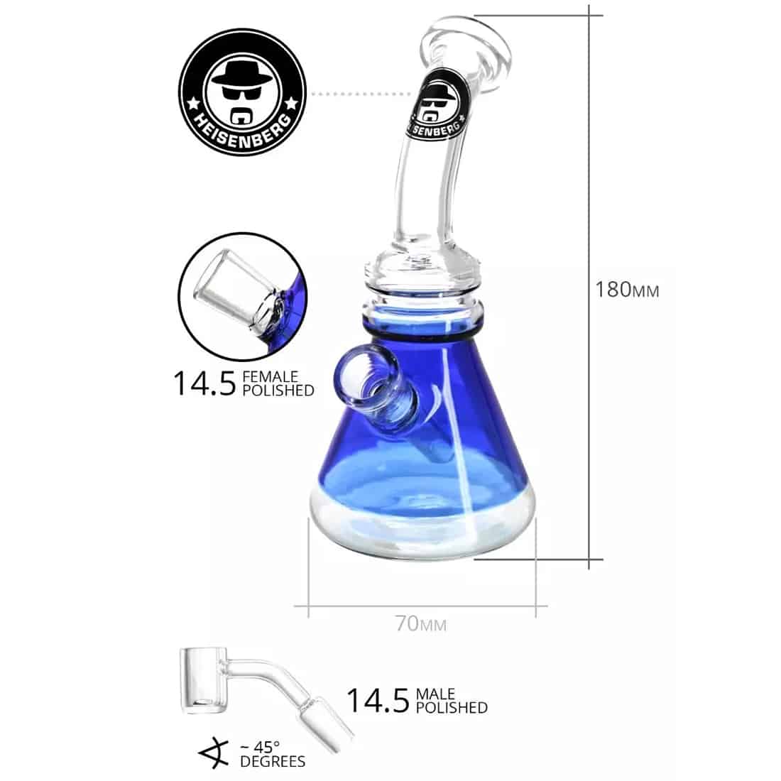 Mangler du en lille kammerat, der kan hjælpe dig med at nyde dine olier og koncentrater på en behagelig og billig måde? Så er Buddy Oil Rig fra Heisenberg lige den ven du leder efter! Denne kompakte olie bong er perfekt til både nybegyndere og erfarne dab rygere. Det klare mundstykke og den blåfarvet base, tilføjer et strejf af klasse til denne allerede stilfulde bong. Den buede bonghals er også sjælden på en såkaldt “beaker bong”, men den bidrager en særlig behagelig ryger, da den er nem at tilgå for munden. Det faste slamrør med slits i enden, kommer med en 14,5 socket, som rummer et perfekt bangerhoved til din olierygning. Denne banger kan selvfølgelig udskiftes hvis du ønsker et alternativt, men anvender du det medfølgende, skal du huske kun at opvarme bunden, og aldrig på siden, da glasset ellers kan ødelægges. Køb din helt egen Buddy Oil Rig i dag, og begynd at nyde de lækre dabs med stil! God ryger!