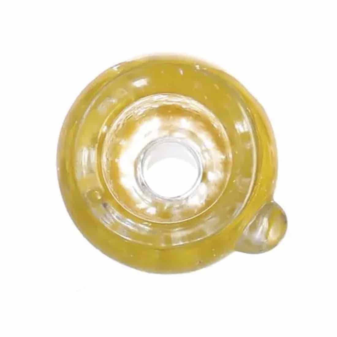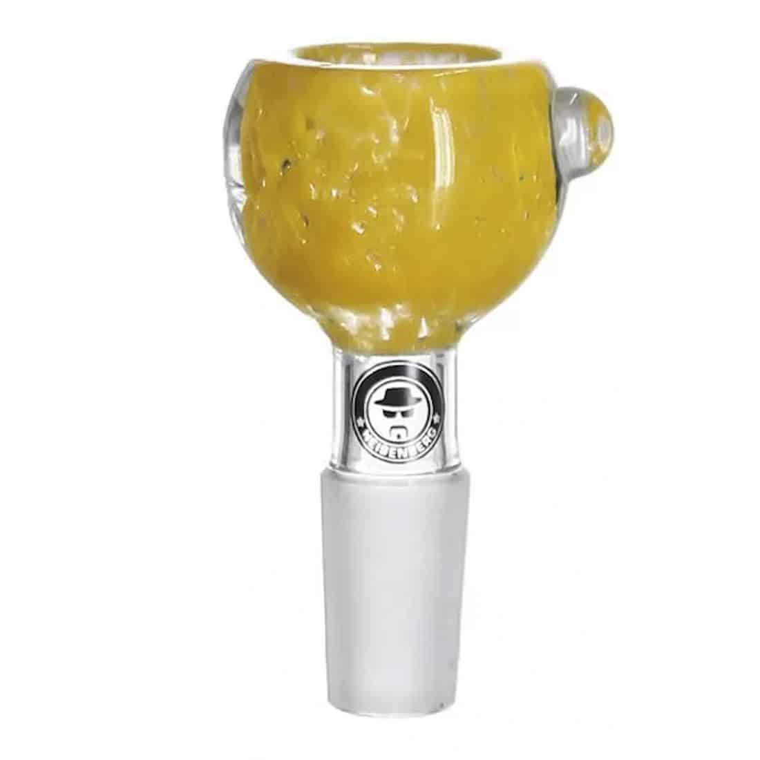 Denne Heisenberg Grins Bowl, er et traditionelt bonghoved med et kugleformet kammer til at brænde dine yndlingsurter på din bong. Den brede glastykkelse fremgår af den betydelige glaskvalitet, og den glider aldrig akavet ud over bordkanten, på grund af den indbyggede rullestopper på siden af hovedet. Toppen af Heisenbergs hoved er markeret med et lille Heisenberg-logo, som passer godt til stilen, samt de gule nuancer. Grinsbowl bonghovede serien har været tilgængelige siden firmaets start, da deres navn var Weed Star, hvilket skyldes den populære størrelse til de erfarne rygere. Så uanset om du leder efter det bedste bonghoved til at få det fulde potentiale af din bong frem, eller om du bare ønsker at give den et gult touch, egner dette sig perfekt. Hvert hoved er prydet med en række forskellige farvepigmenter, for at give det sit eget særprægede udseende som en del af et karakteristisk design. Hvert hoved er derfor unikt, da teksturerne varierer en smule fra den ene til den anden. Vi anbefaler at du bruger en Spoon Screen på 15 mm til dette hoved.