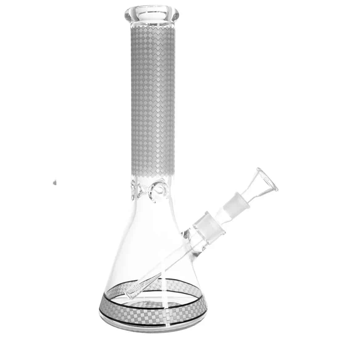 Dette er en klassisk kolbe bong fra det anerkendte tyske mærke Heisenberg. Bongen har et skakbrætlignende mønster af små firkanter, som skiftevis er selvlysende og sølvfarvet, med et let metallisk glimmer. Denne effekt fremkommer ved hjælp af et lag lak, der er anbragt på kolbens runde bund, samt på bongens hals hvor printet forekommer. Chess bongen kommer med en dyb isfanger i midten, som gør det muligt at køle røgen med isterninger, og skabe en mildere og afkølet røg. Bongens afrundede mundstykke, giver en behagelig pasform for læber og mund, og gør den god til både begyndere og erfarne rygere. Hvis du ikke er så komfortabel med at bruge en bong med et stort hovede, anbefaler vi at du udskifter hovedet med et mindre et, i en SG 18,8 mm størrelse. For at opnå de bedste resultater, og undgå at mixet ryger ned i vandet når du ryger, skal du også købe en 12-15 mm rist til hovedet, da disse ikke medfølger som standard. Bemærk at for at opnå den stærkeste og længstvarende selvlysende effekt, skal du udsætte din bong for direkte sollys, eller en stærk lyskilde i et længere stykke tid.
