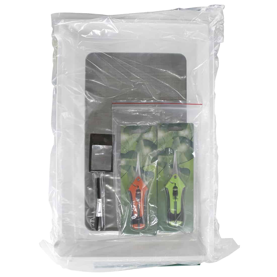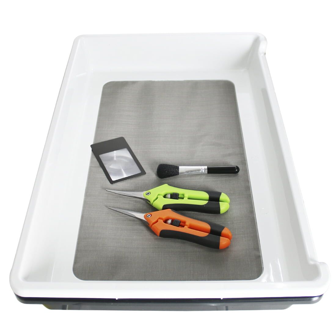 Heisenberg Trimtray er den perfekte hjælper til trimning af dine cannabisplanter. Den består af to dele, et øverste og et nederste plastiklag, der hurtig og nemt kan adskilles når du er færdig med din trimning. Det øverste lag har en finmasket skærm, der er lavet af rustfrit stål med en maskestørrelse på 150 my. Dette sikrer at intet plantemateriale går tabt, og du kan opsamle den overskydende pollen samt de små blade og støv, i den nederste del af bakken til senere brug. Den er stor nok til at rumme en god mængde af dit plantemateriale, og så er den let at rengøre bagefter.De medfølgende beskærersakse fra Heisenberg er også uundværlige når det kommer til trimning af cannabis. De har spidse klinger fremstillet af rustfrit stål, og er designet til at skære præcist på selv de mindste og mest skjulte steder på planten. Det er to forskellige sakse, den ene med en buet klinge, og den anden med en lige klinge, der giver dig mulighed for at arbejde med forskellige dele af planten, og opnå et perfekt resultat hver gang du trimmer.Der medfølger naturligvis også en lille botanikerlup, der er en essentiel del af trimningsprocessen, og er den perfekte størrelse til formålet. Den er let at bruge, og giver dig samtidig mulighed for at se plantematerialet i små detaljer, og dermed finde de små steder der skal trimmes yderligere. Den er også let at transportere med rundt og opbevare, da den har samme størrelse som en kreditkort.Yderlig bliver den også leveret med en smart pollenpensel, der er en lille og handy pensel, der er designet til at hjælpe dig med at opsamle det nedfaldende pollen fra planten. Den er også særdeles let at bruge, og kan skrabe selv de mindste hjørner af trimmebakken. Så alt i alt er Heisenberg Trimtray Set den ultimative hjælper til trimning af dine cannabisplanter. Med de medfølgende præcisionssakse, botanikerlupe og pollenpinsel, vil du opnå et perfekt resultat hver gang. Sættet er let at bruge, rengøre og opbevare, og brugervejledningen giver dig alle de oplysninger som du behøver for at bruge sættet på den mest effektive måde, hvilket gør denne trimbakke til et must-have for enhver cannabisdyrker.