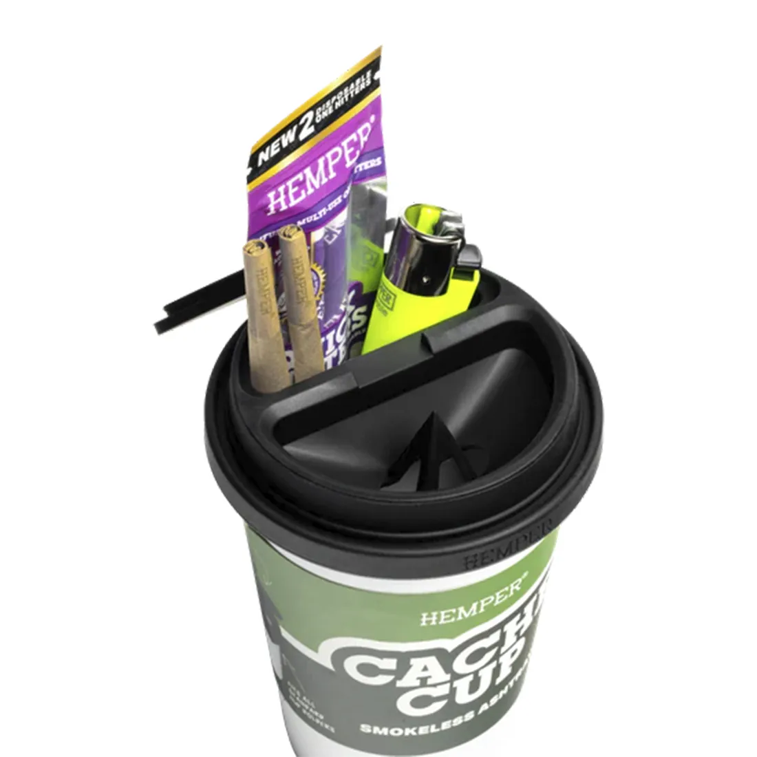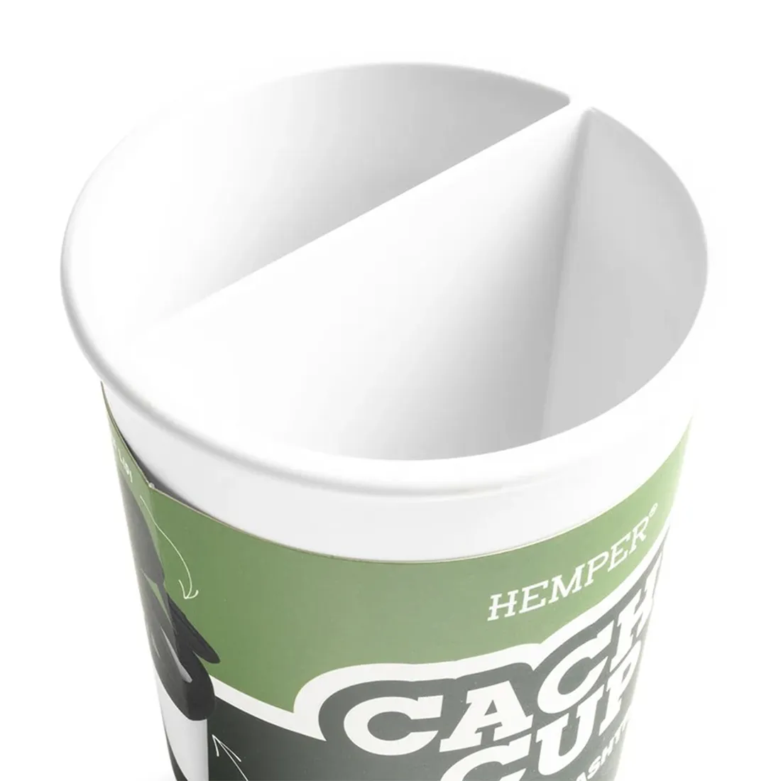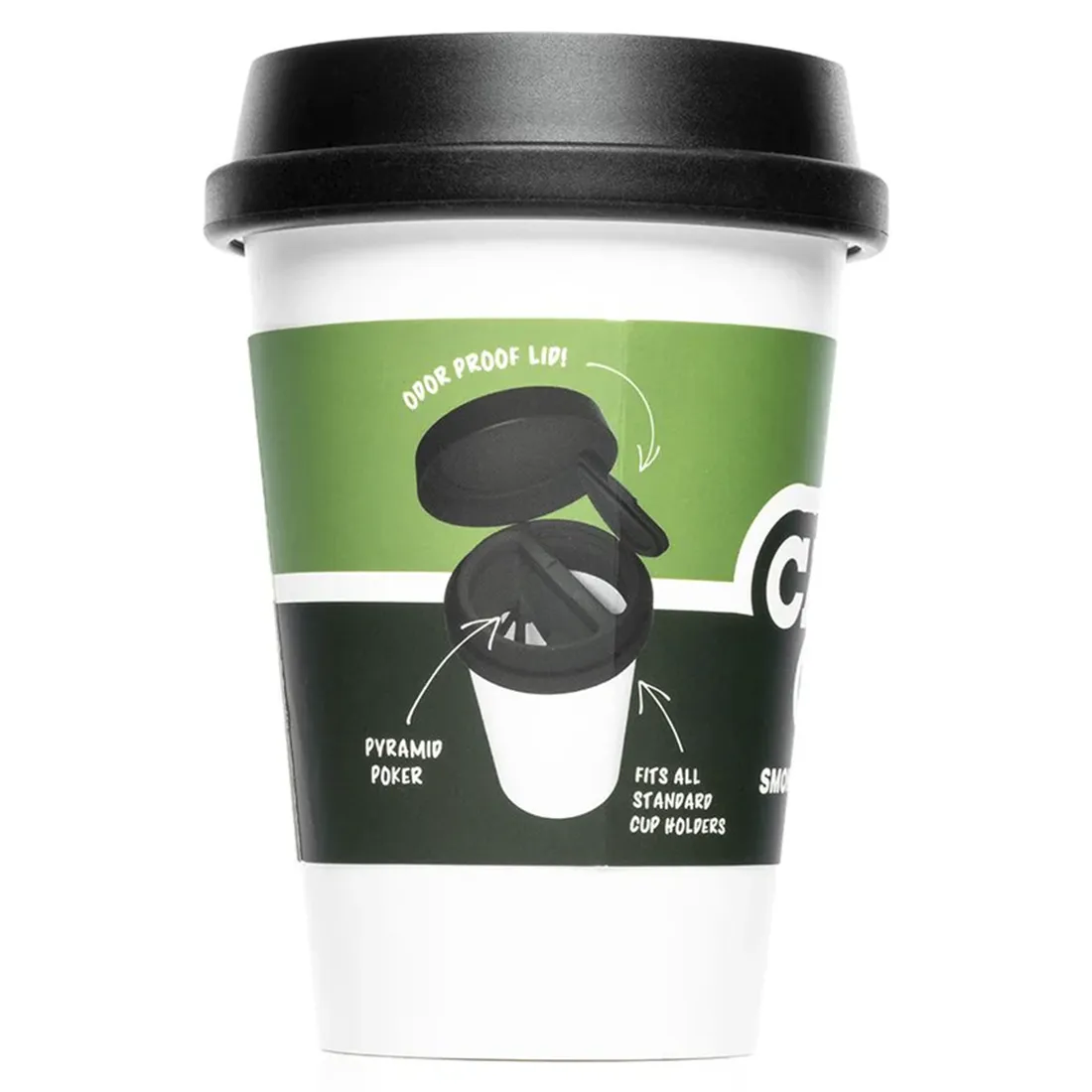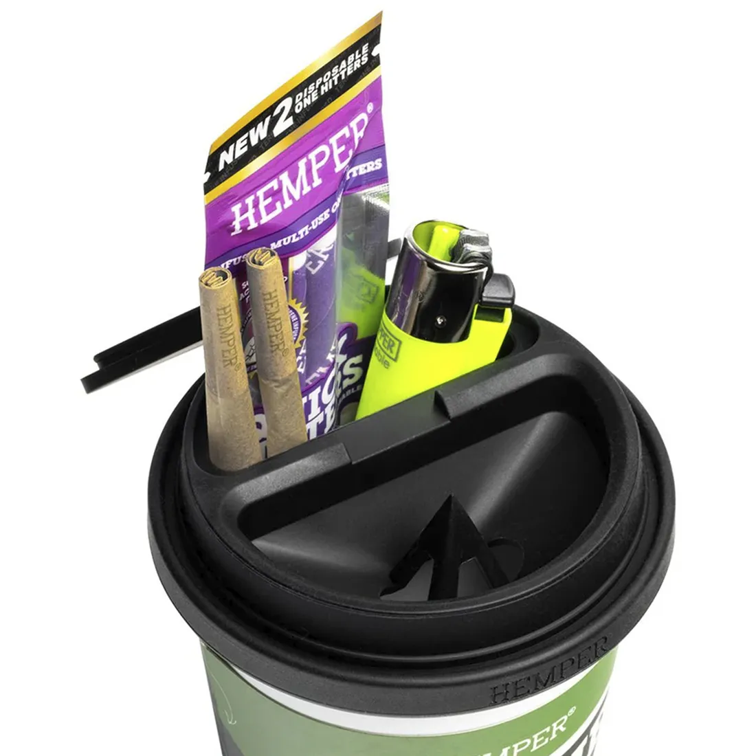 Den hvide HEMPER Cache Cup er ikke bare clean at se på, den er også særdeles praktisk! Bag det uskyldige kaffekop design gemmer der sig et røgfrit askebæger, der kommer med silikoneindsats, og et smart pyramideformet værktøj til at tømme dit hovede. Låget er 100 % lugttæt, og holder alle lugte og aske lukket inde, så du kan ryge diskret og smide det hele væk senere. Passer direkte i bilens kopholder, så du har altid et askebæger ved hånden, uanset hvor turen går hen.