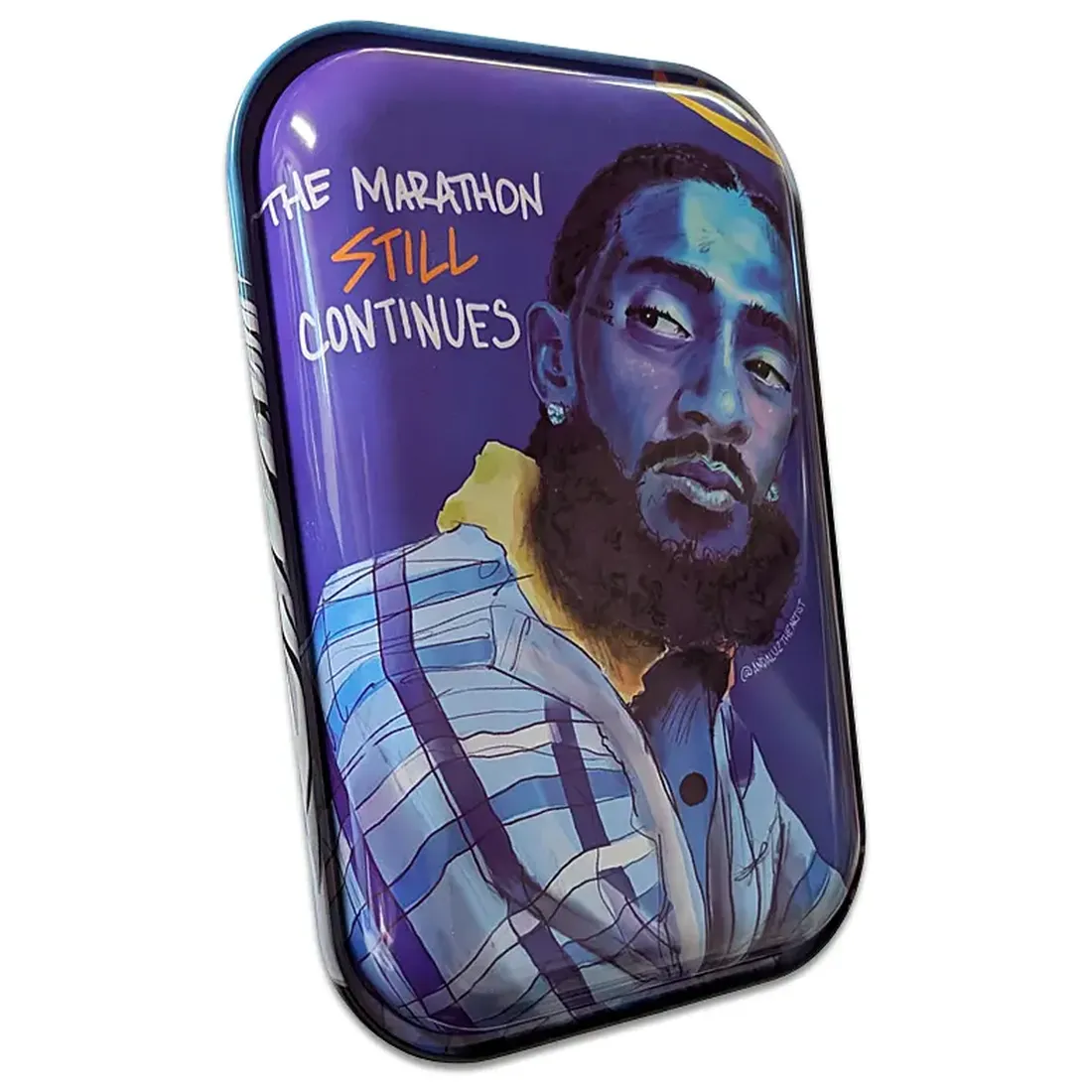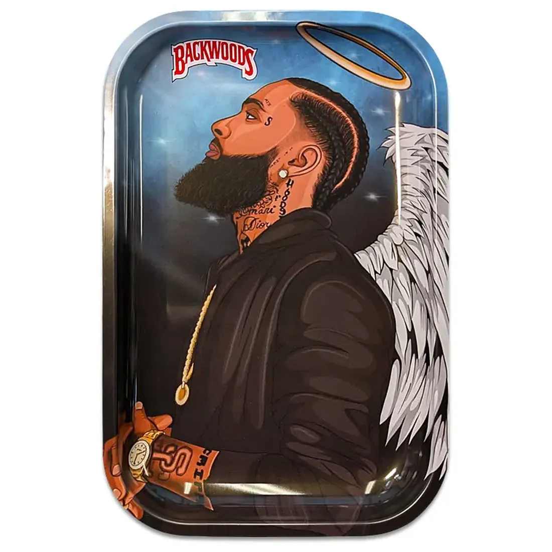 Angel Hustle fra Jelly Joker er en metalbakke i 285 x 188 mm med et markant portrætmotiv. Forsiden viser et portræt med glorie og vinger, bagsiden har et lettering-portræt med en mere rå stil. Motivet er trykt på begge sider, og 285 x 188 mm giver god plads til papir, filtertips og det løse.