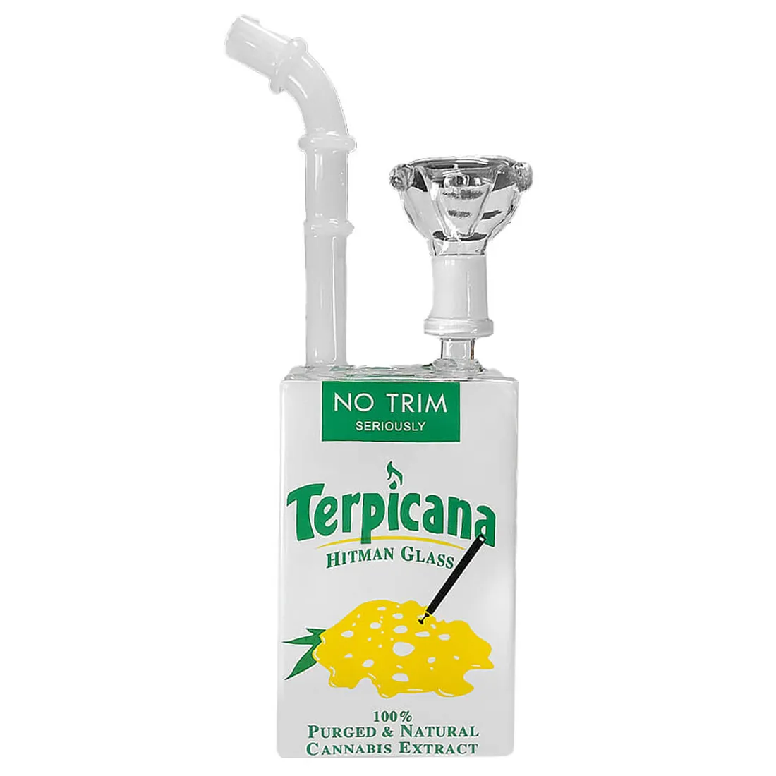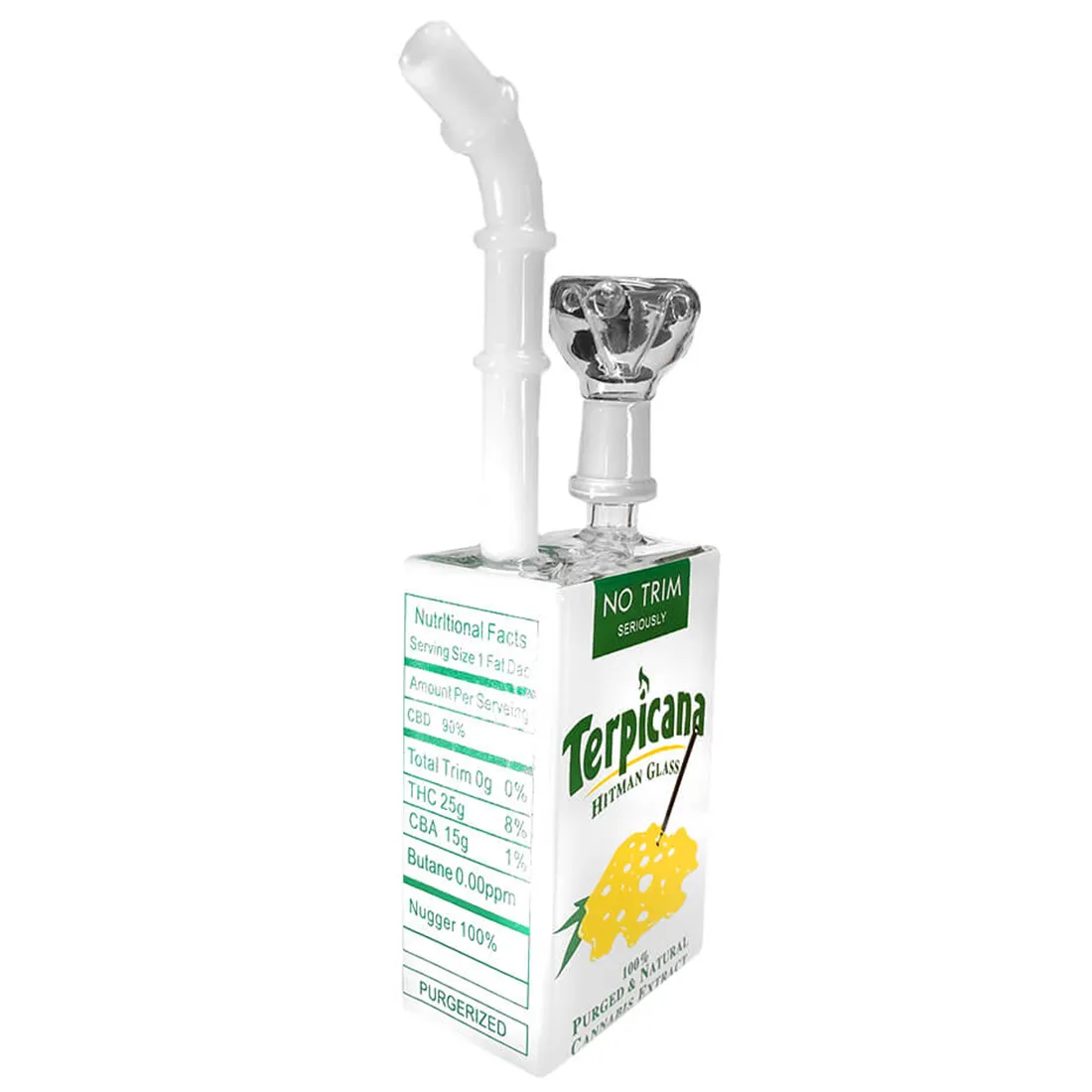 Hvis du er på udkig efter en sjov og unik bong, så er denne Terpicana Bong fra Juice Glass sikkert lige noget for dig! Den har nemlig et sjovt og kreativt design, der minder om en juicekarton, og ikke ses så ofte! Dette gør dog bongen utrolig svær at rengøre, da delene ikke kan skilles ad, og betyder at den mest egner sig til bong samlere, der ønsker noget sjovt og anderledes i deres kollektion, eller blot ønsker at bruge den til specielle anledninger, der gør at den ikke skal rengøres så ofte. Bongen er lavet af højkvalitets glas, hvilket sikrer en ren og behagelig rygeoplevelse hver gang den tages i brug, og med sin kompakte størrelse på blot 19 cm, og det komfortable sugerør mundstykke, gør den nem at ryge fra. Husk dog at skylle efter hver gang den har været i brug, på den måde holder du standen pænest, og anbefales kraftigt da den ikke kan rengøres med en børste. Vi anbefaler desuden at bruge en rist på 10 mm til denne bong, men kan også bruges uden af lufthullet er ekstra lille.