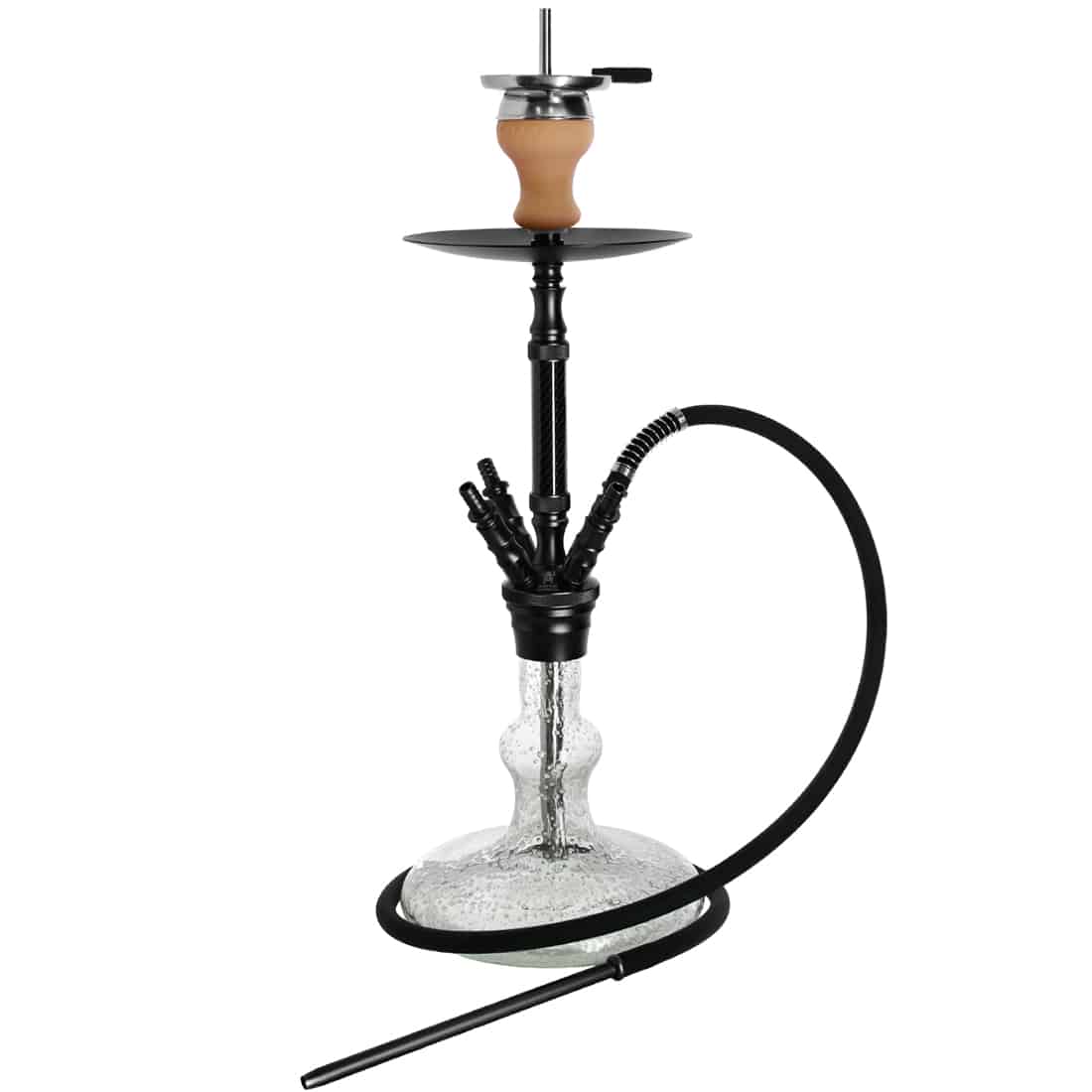 Den leveres med en skorsten, rist og lerhoved, mundstykke i aluminium og en silikoneslange med en længde på 150 cm, og vandpibens flotte buede glaskolbe er farvematchende med resten af vandpiben, og har en kapacitet på 480 ml.
