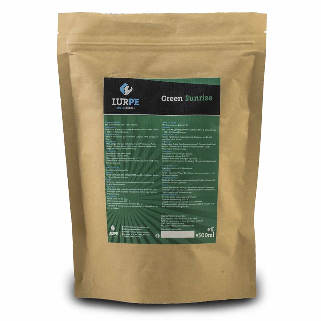 I denne Green Sunrise blanding fra Lurpe Natural Solutions, har de udvalgt de bedste ingredienser til at skabe en næringsrig kompost te blanding, som bruges til vanding i vækst fasen. Det nøje udvalgte organiske materiale, samt andre ingredienser udgør Green Sunrise det optimale nærringssupplement til dine planter i vækst fasen. Indeholder en nøje udvalgt og lang række gavnlige mikroorganismer, heriblandt, Mycorrhizal og Trichoderma fungi, som står for nedbrydningen af det organiske materiale, og dermed bidrager med næring til dine planter. Alle ingredienser er godkendt til anvendelse i økologisk landbrug. Så dette er for dig der gerne vil få mest muligt ud af de levende bestanddele i jorden.