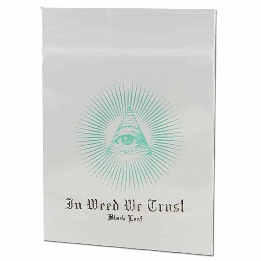 Hold styr på dine småting med et ekstra twist af konspirations attitude og mystik, med disse “In Weed We Trust” lynlåsposer fra Black Leaf. Poserne måler 40×60 mm, og kommer med det ikoniske illuminati-design, og er perfekte til opbevaring af alt fra urter og mix, til snacks og krydderier. Lavet af holdbart fødevaregodkendt plastik, er disse poser både slidstærke og sikre at bruge til madvarer som krydderier eller godbidder. Uundværlige poser til konspirationsentusiaster, der gerne vil opbevare deres ting med god stil. Hver pakke indeholder 100 stk.